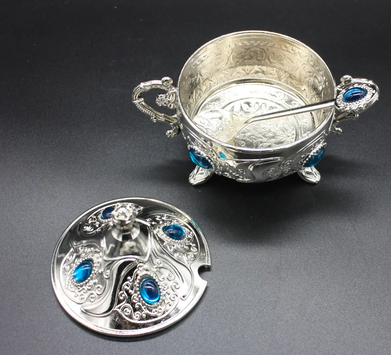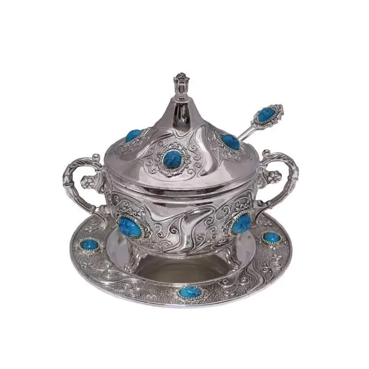 Форма, будто вдохновлённая восточной сказкой, придаёт сахарнице особый шарм и делает её центральным элементом любого застолья. Это не просто посуда — это акцент, который говорит о вкусе, стиле и любви к прекрасному. Поднос и ложечка в едином дизайне завершают образ утончённой роскоши.