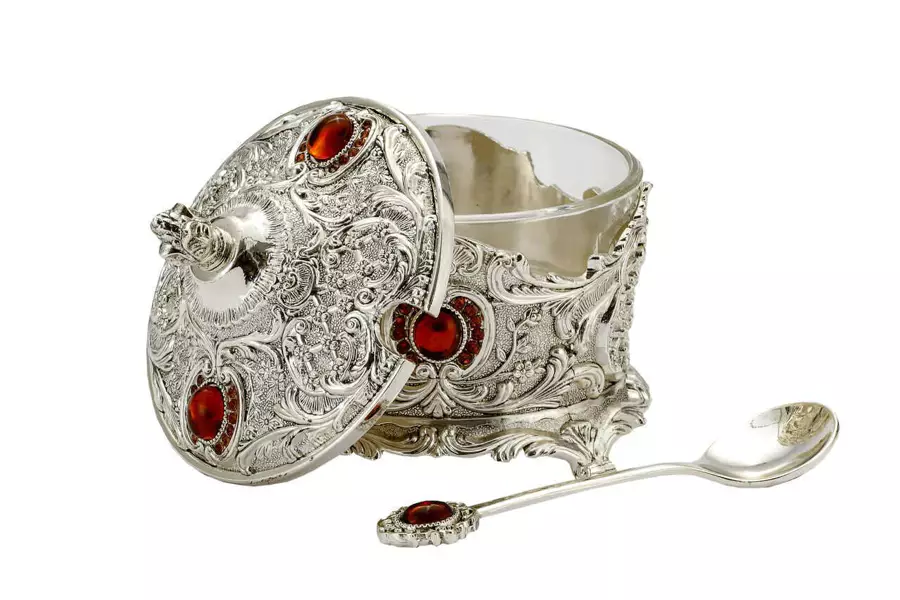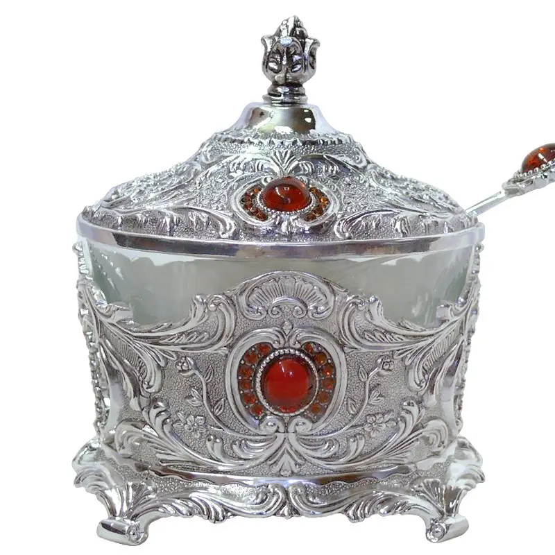 Погрузитесь в атмосферу аристократической утончённости с сахарницей «Изумруд» — настоящим произведением декоративного искусства. Высотой 11 см и объёмом 175 мл, она идеально сочетает функциональность и роскошный дизайн. Элегантные барельефы, изысканная гравировка и вставки под драгоценный камень придают ей по-настоящему царственный облик. Ложечка в комплекте — как изысканная вишенка на торте.