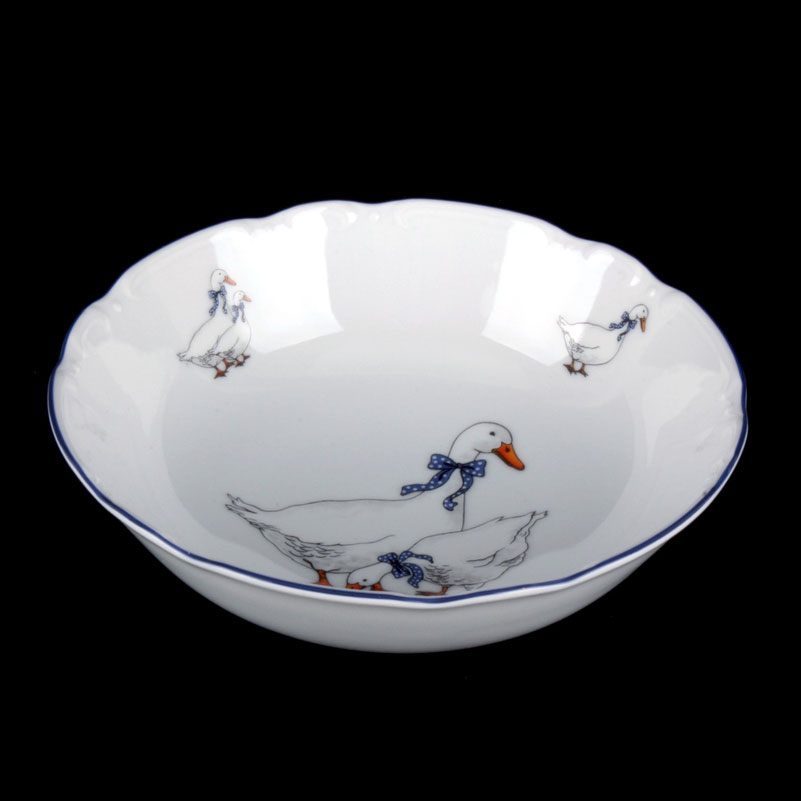 Салатник фарфоровый белый круглый с рисунком Thun Constance Гуси 23 см с синей каймой