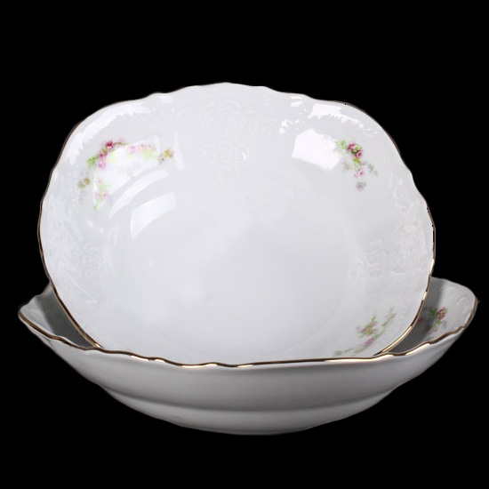 Одиночные салатники диаметром 23 и 25 см — настоящие универсалы. Они подойдут как для свежих овощей, так и для изысканных слоёных салатов, закусок или даже подачи фруктов на компанию. Их рельефный край и золотая окантовка придают фарфору изысканный вид, достойный торжественных моментов.
