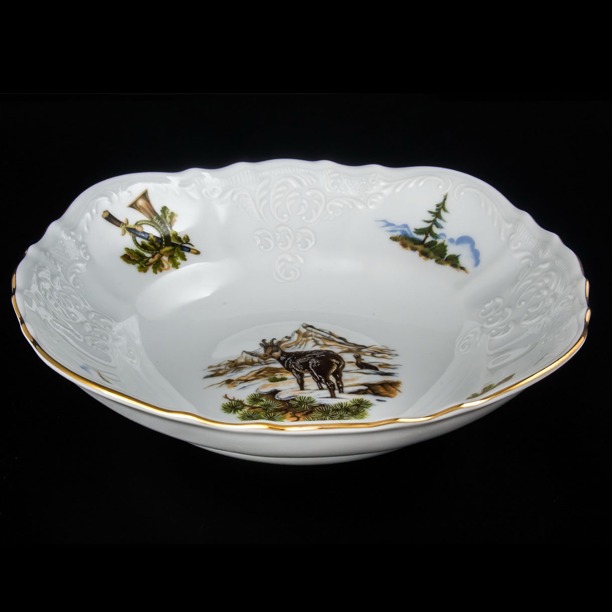 Салатник 25 см — выбор для щедрых угощений и эффектной сервировки. Его внушительный диаметр и изысканный рисунок с охотничьими сценами делают его центром внимания на любом праздничном столе. Это не просто предмет утвари, а семейная реликвия.