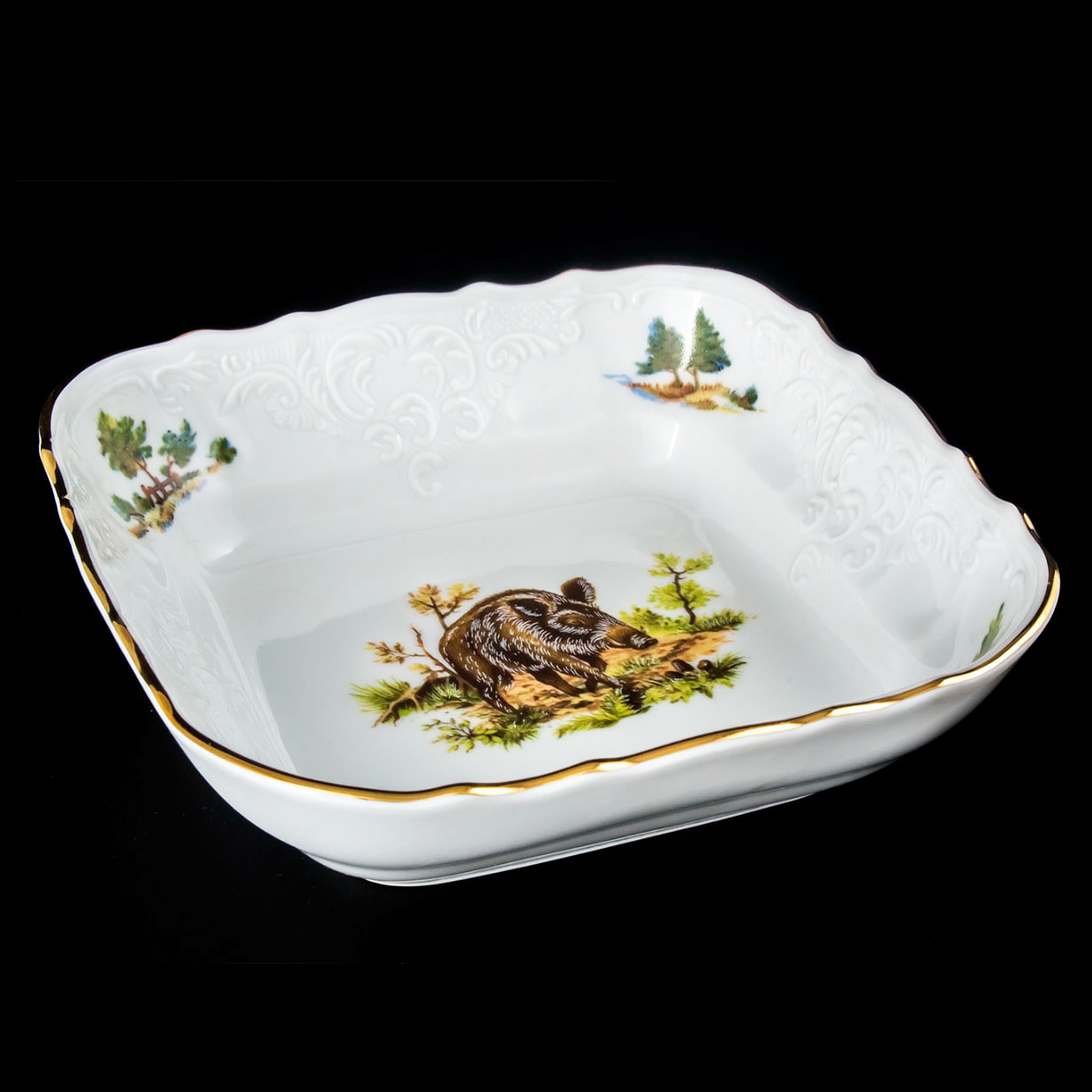 Салатник фарфоровый квадратный с рисунком Bernadotte Охота 25 см с золотой каймой