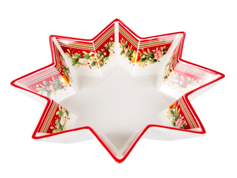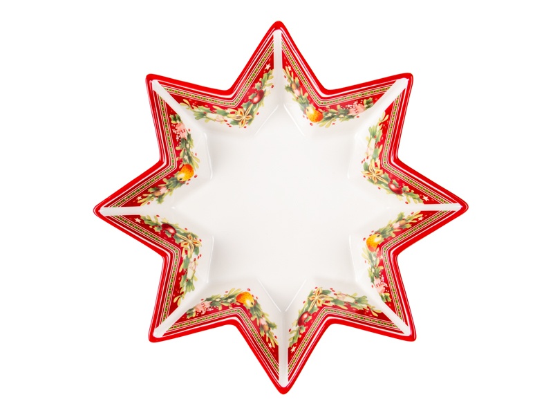 Фарфоровый новогодний салатник Рождественская Коллекция диаметром 26 см выполнен в оригинальной форме звезды, символизирующей праздничное сияние и уют домашнего вечера. Богатый декор с еловыми ветвями, звёздами, ягодами и рождественскими лакомствами делает его центральным элементом сервировки. Тонкая красная окантовка подчёркивает изысканный дизайн и создаёт яркий акцент на праздничном столе.