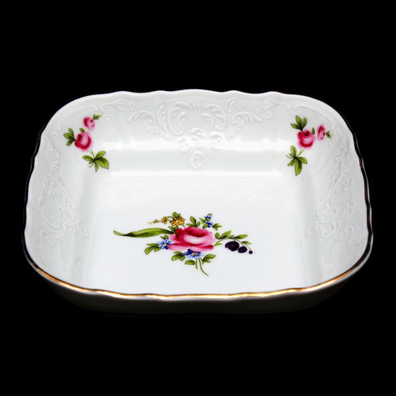 В этих салатниках строгие линии квадратной формы удивительным образом сочетаются с мягкостью цветочного декора. 16-сантиметровый вариант — идеальный спутник для утренних хлопьев, орешков или утончённых порций салата. А более вместительный 25-сантиметровый салатник подойдёт для подачи гарниров или эффектных миксов из овощей. Каждый изгиб, каждая линия и каждый цветочек на фарфоре словно написаны кистью художника, а золотая кайма добавляет благородства. Эти предметы станут ярким акцентом на вашем столе и подчеркнут чувство вкуса хозяйки.