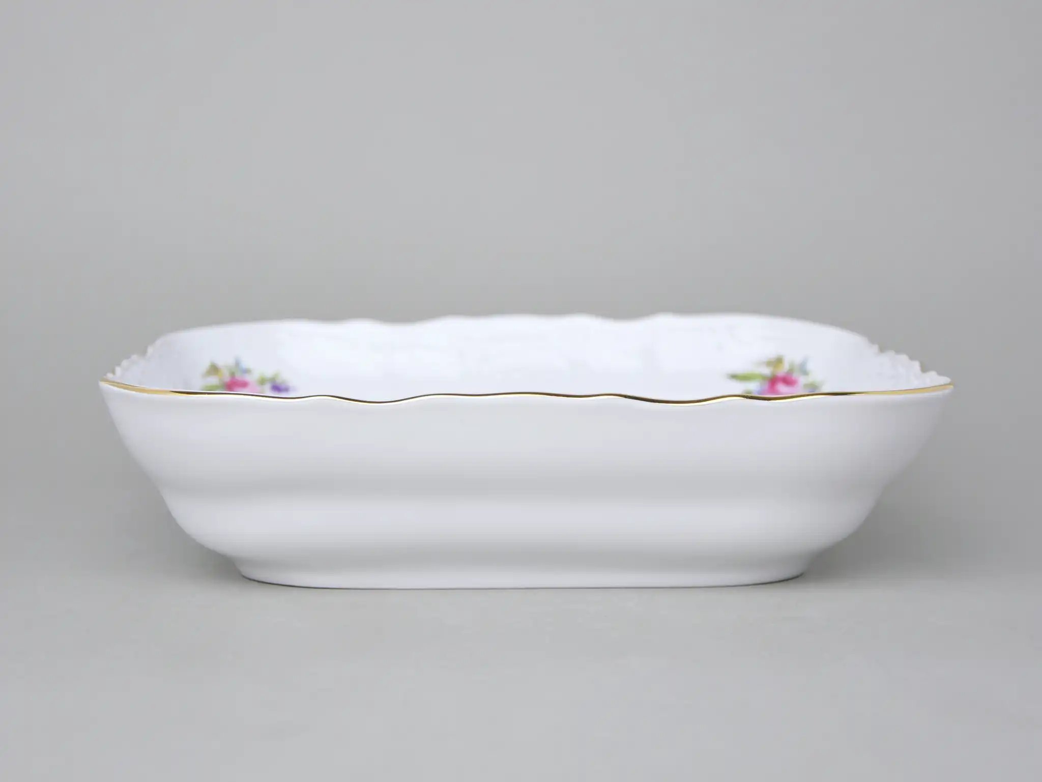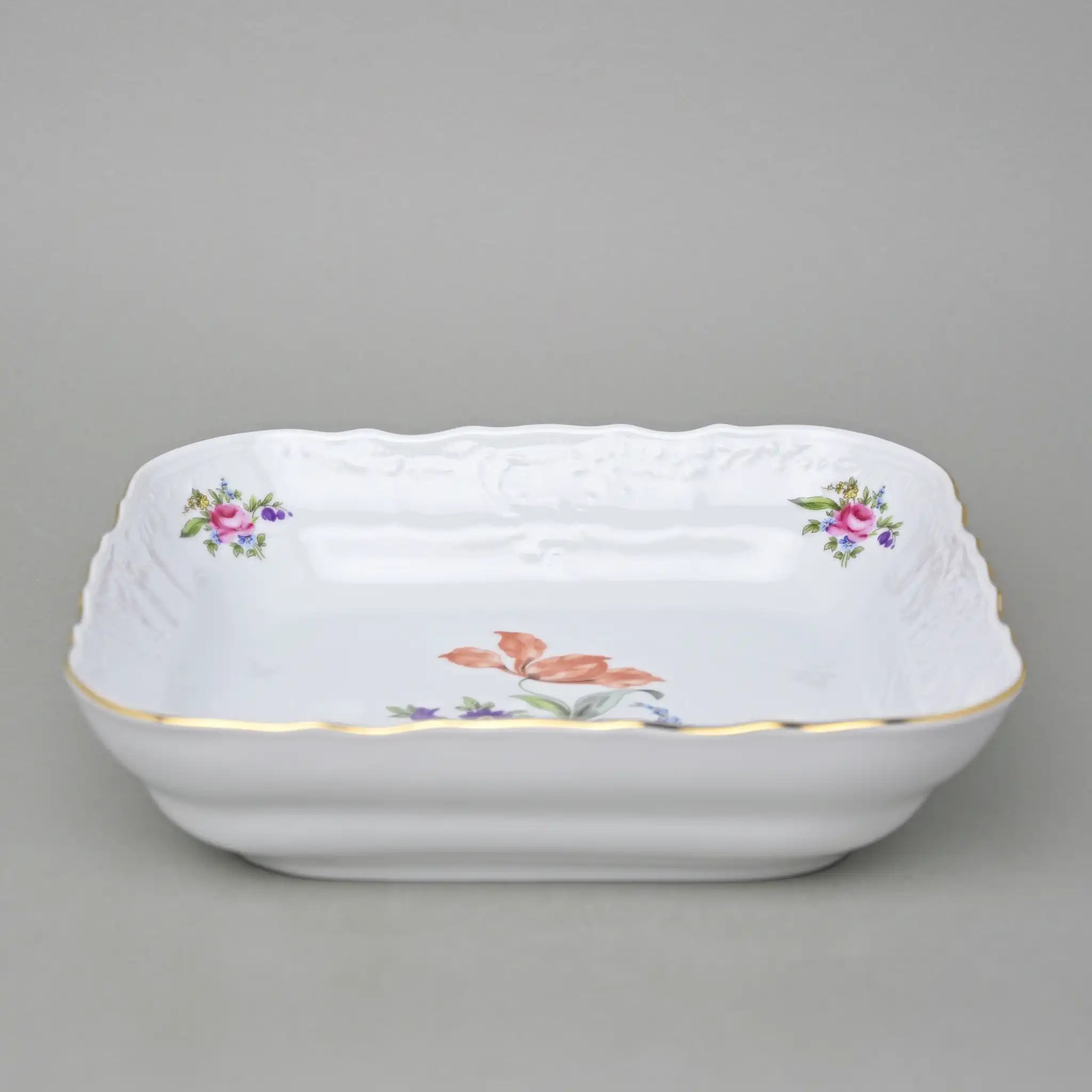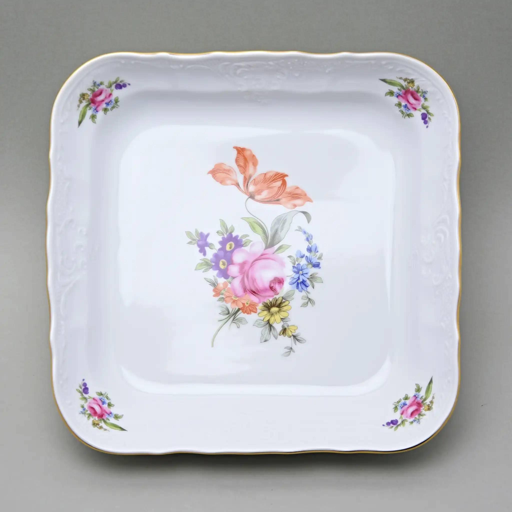 Салатник квадратный фарфоровый белый с цветочным орнаментом и золотой окантовкой Thun Bernadotte Мейсенский Букет 25 см