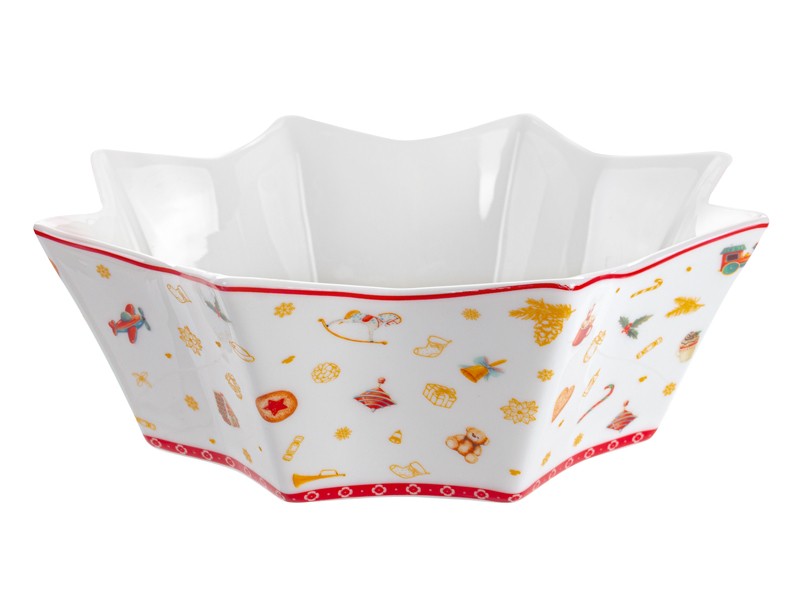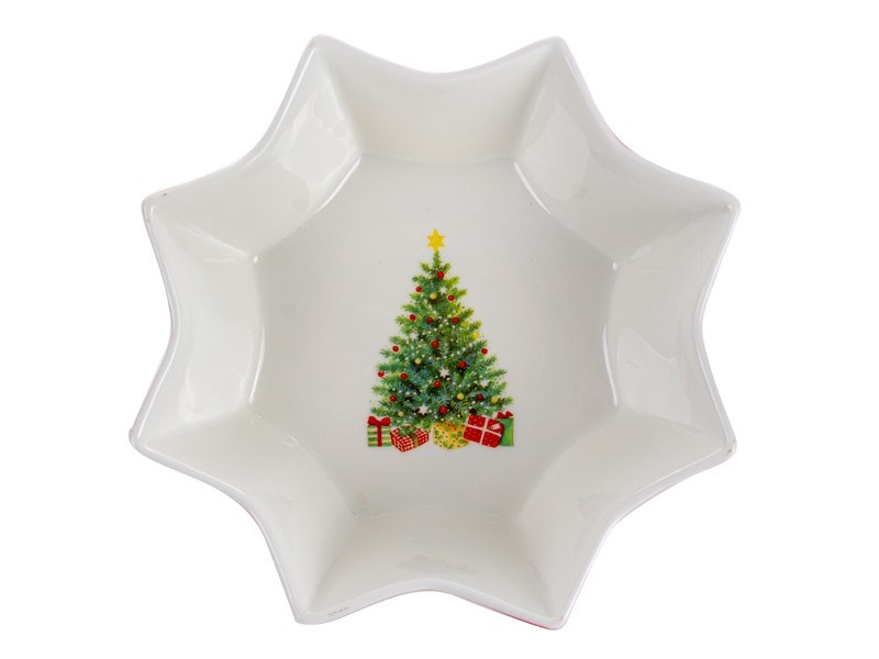 Фарфоровий салатник Christmas Delight діаметром 23 см — це яскравий акцент, який наповнить ваш дім атмосферою зимових свят та родинного тепла. Усередині на білосніжній поверхні зображена ошатна ялинка з подарунками біля основи, а зовні салатник прикрашений насичено-червоним фоном із золотими новорічними мотивами — іграшками, сніжинками, дзвіночками та святковими символами. Зіркоподібна форма додає виробу виразності та робить його справжньою окрасою святкового столу.