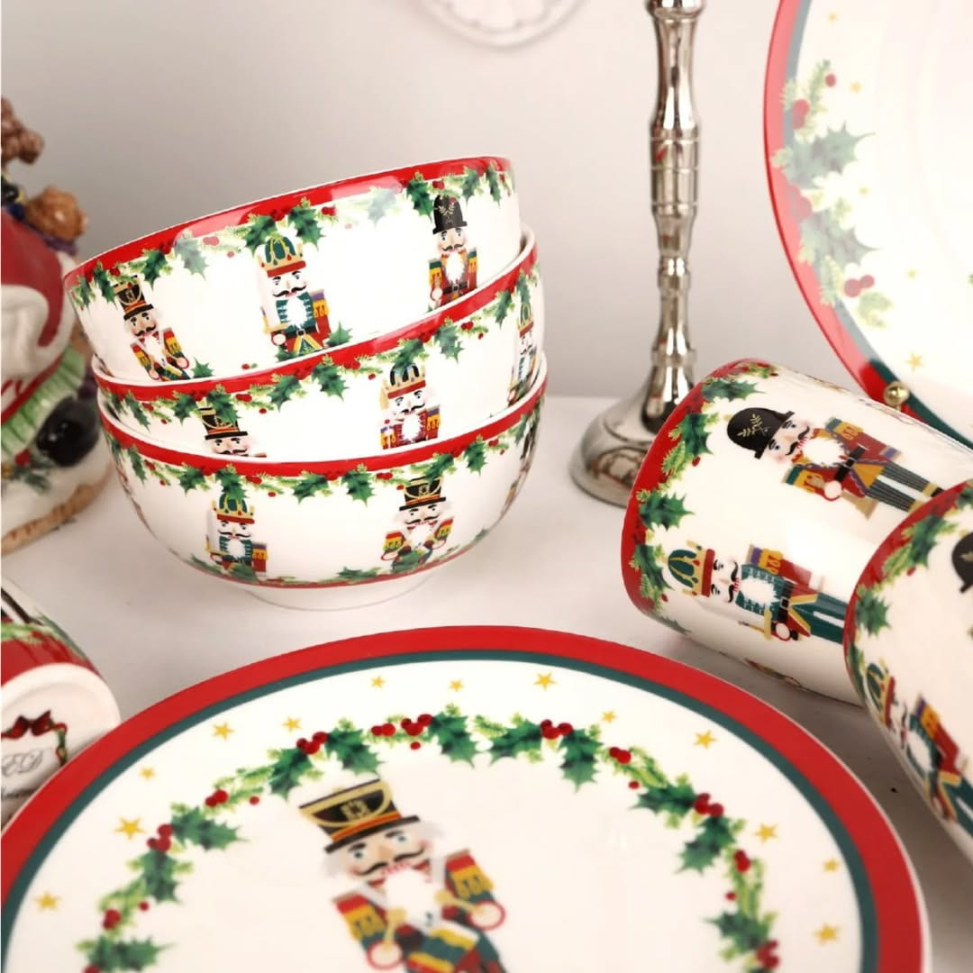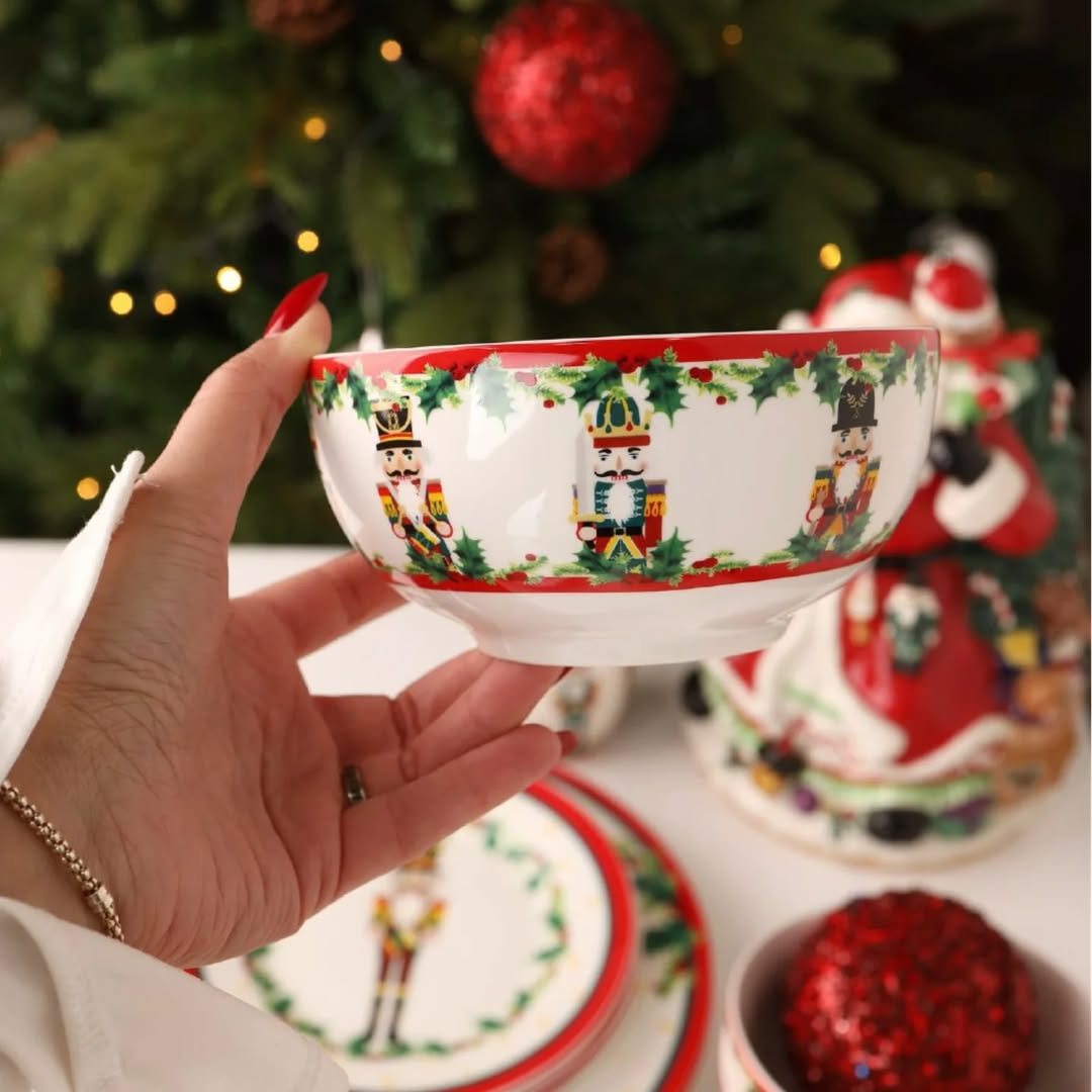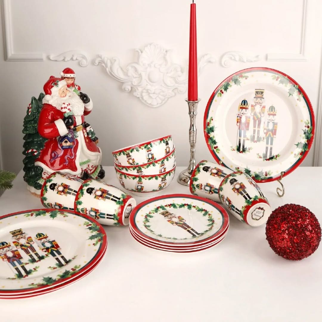 Колекція фарфорового посуду «Лускунчик» — це справжня різдвяна казка, втілена в сервіровці вашого столу. Яскраві зображення Лускунчика, обрамлені святковими вінками з падуба та червоних ягід, створюють атмосферу затишку й нагадують про улюблені зимові традиції. Такий посуд не лише прикрашає святковий стіл, а й наповнює його особливим настроєм, даруючи радість усій родині.