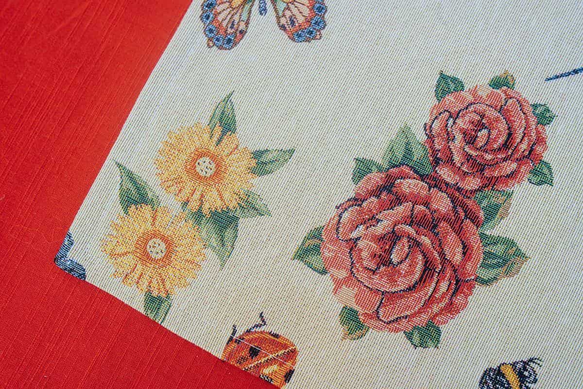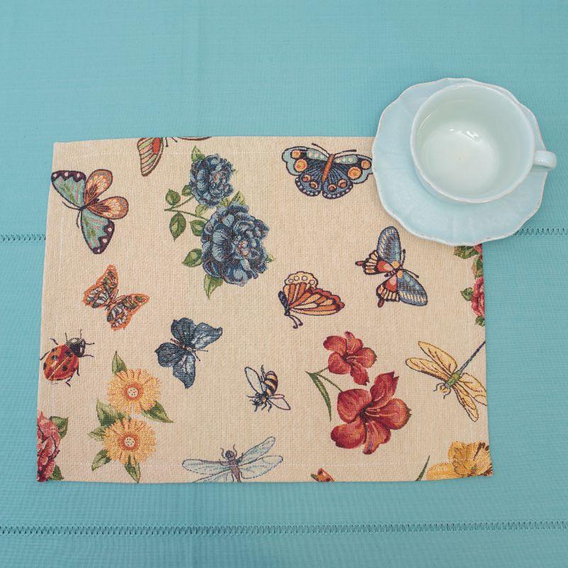 Легкие крылышки порхающих насекомых и красочные лепестки нежных цветов стали выразительными мотивами орнамента, вытканного на теплом бежевом фоне тысячами разноцветных волокон. В состав практичного хлопкового гобелена включен полиэстер, предотвращающий потерю цвета и деформацию изделия.