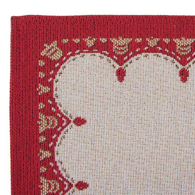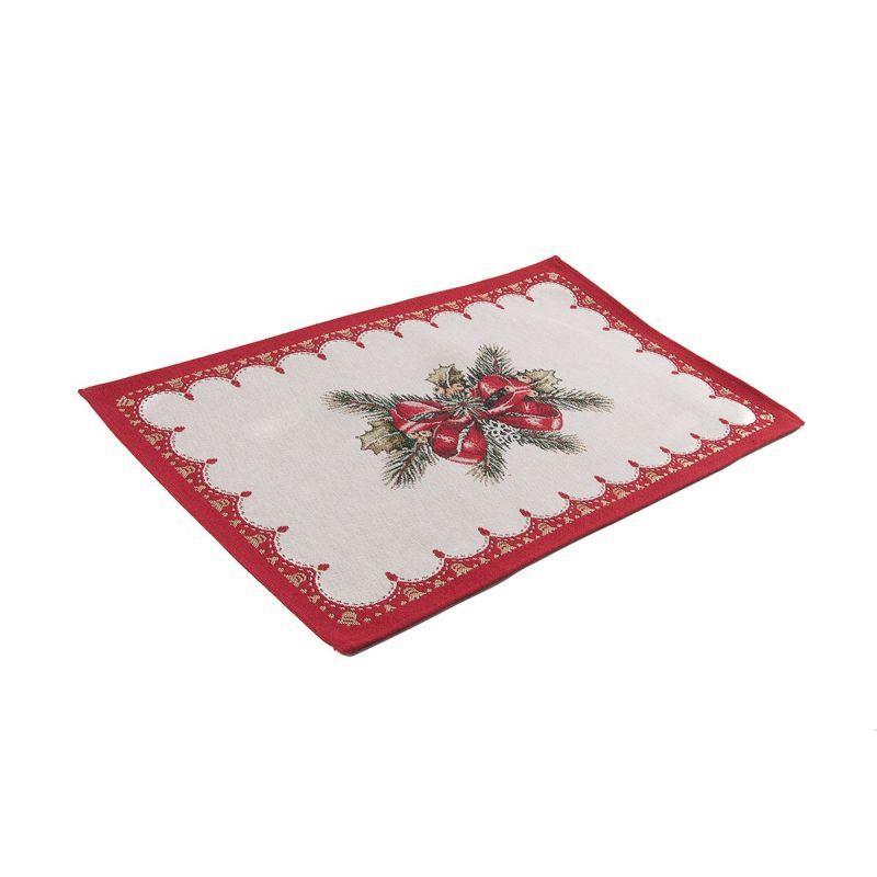 Ошатна серветка з традиційною різдвяною композицією чудово впишеться у святковий інтер'єр. На білому тлі зображені гілочки ялинки та падубника, перев'язані червоним бантом. Нитки люрексу змушують малюнок сяяти і переливатися. Червона фігурна окантовка по краю виробу робить його урочистішим. Дана серветка гармонійно виглядатиме на однотонній, а також на скатертині з цієї ж колекції.Елементи малюнка та яскраве окантування виткані на суцільному жакардовому полотні. У тканину вплетені волокна люрексу, що створює м'які переливи по всій поверхні. Гобелен з тефлоновим просоченням не вбирає рідини, плями від їжі не проникають у середину ниток і дуже легко видаляються.