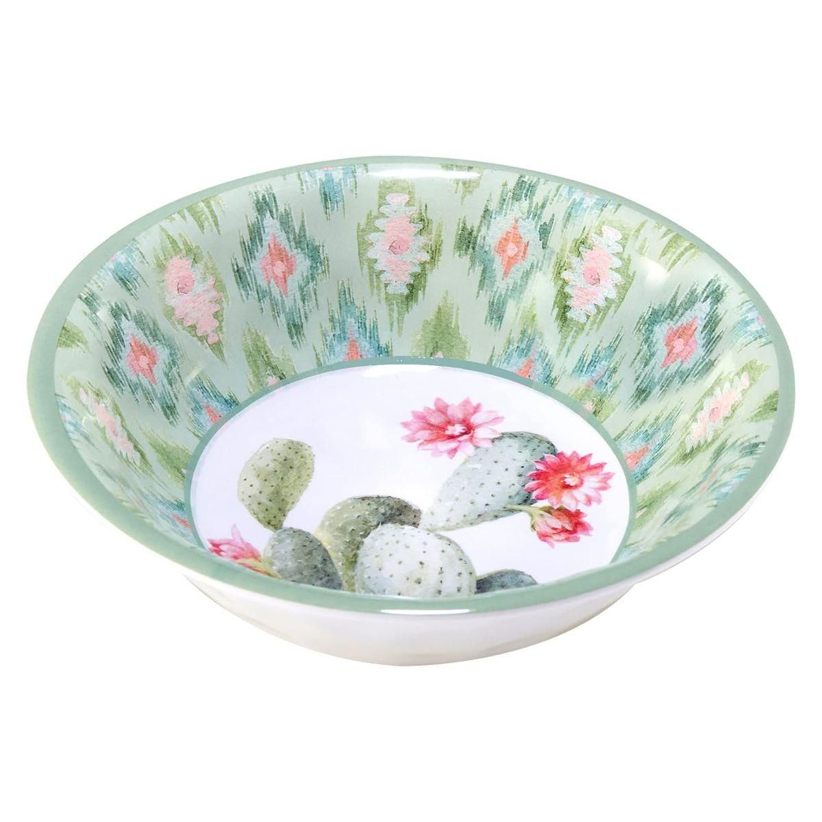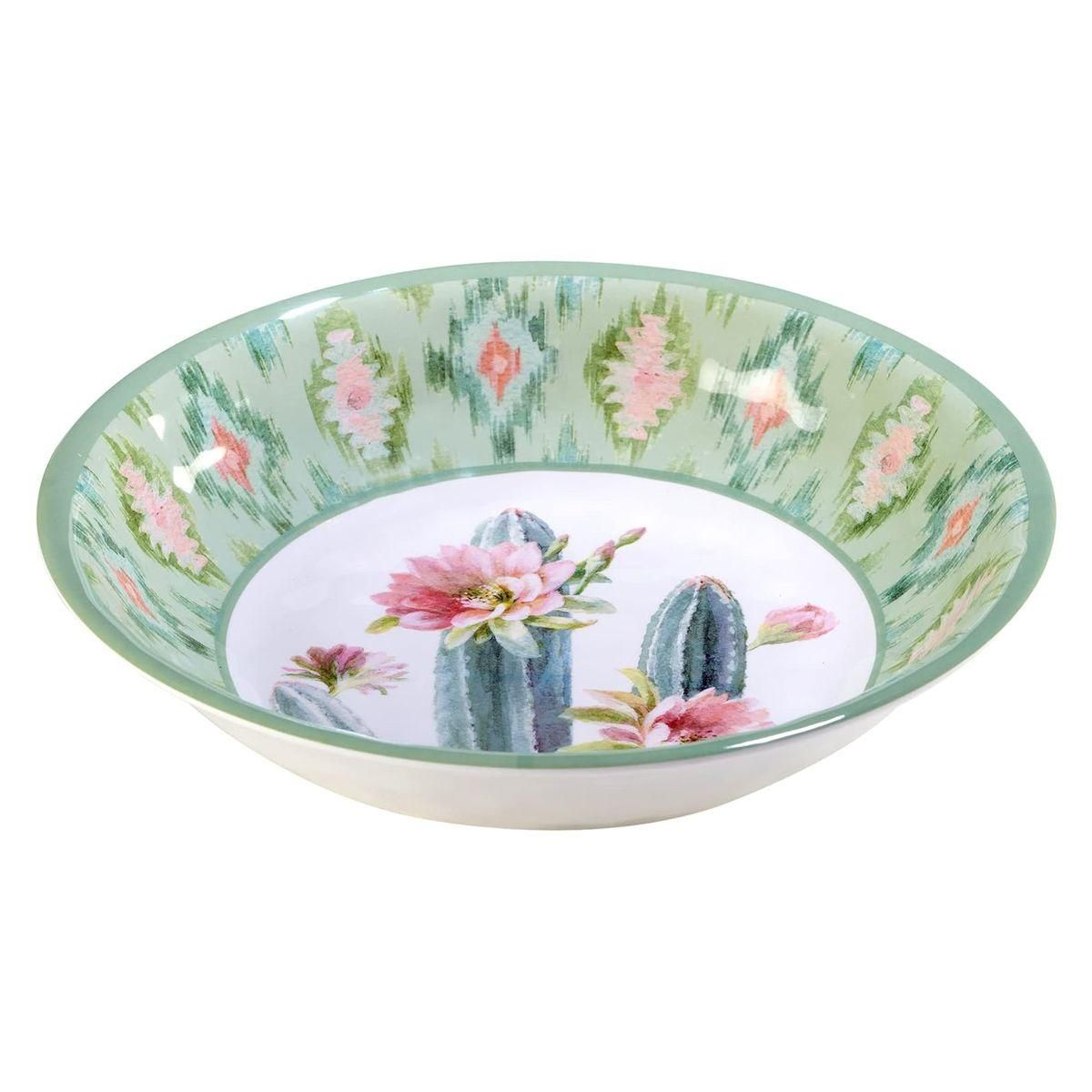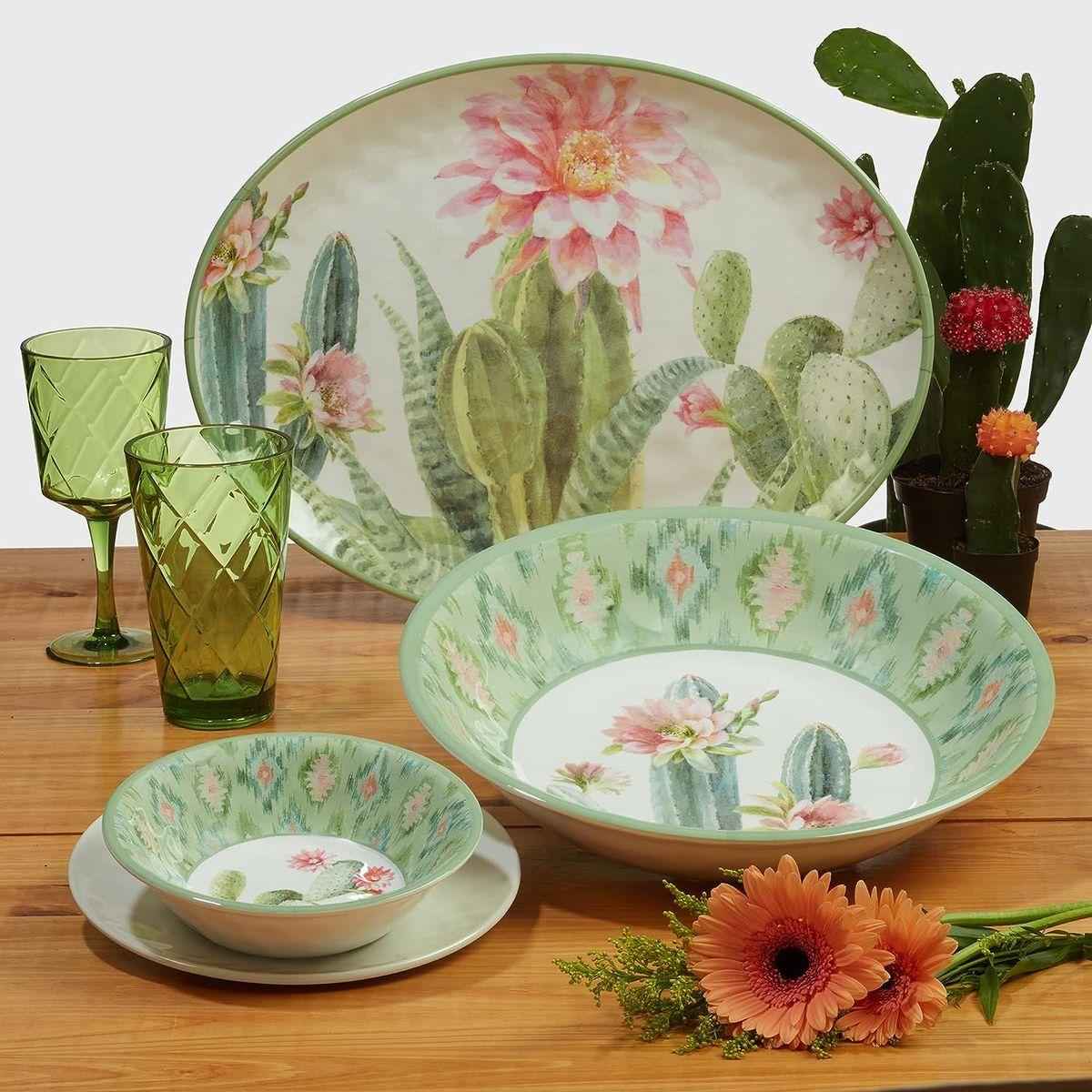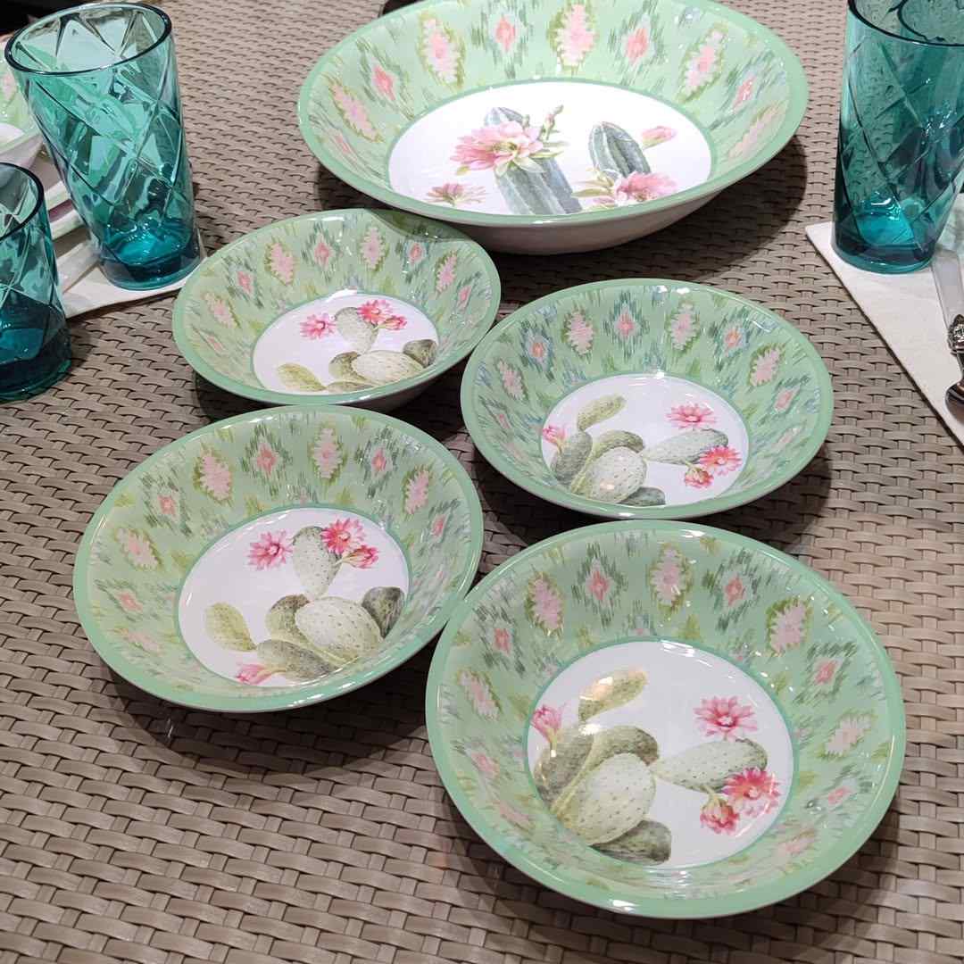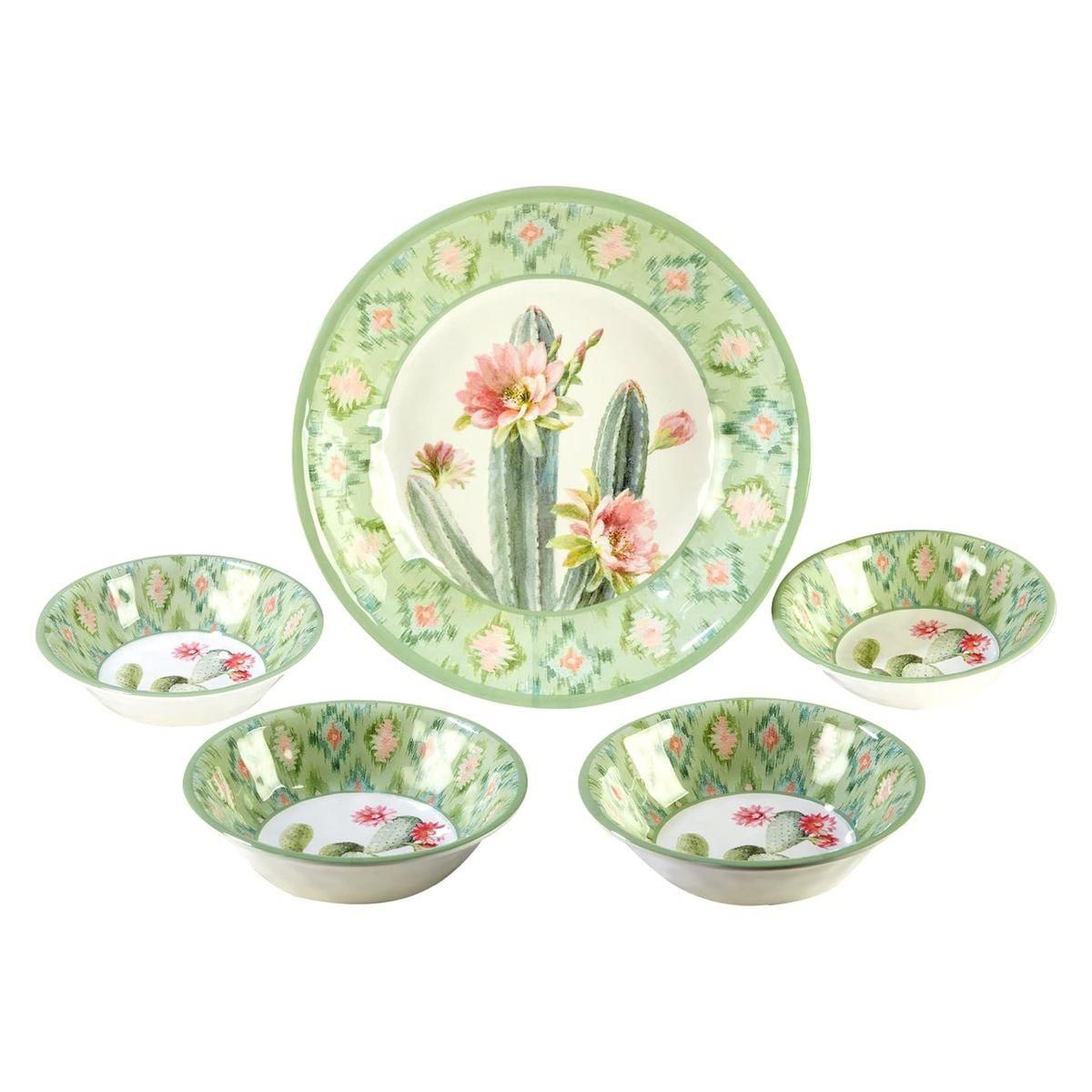 Сервировочный набор «Красавица пустыни» состоит из пяти меламиновых блюд, оформленных в зеленой кактусовой гамме. Большое блюдо имеет диаметр 35 см и высоту 7 см, а каждая пиала — диаметр 20 см и высоту 5 см. Меламин отличается ударопрочностью, не содержит бисфенола и полностью безопасен для здоровья, что подтверждается сертификатами безопасности. Блюда можно мыть в посудомоечной машине при температуре не выше +70°, но нельзя использовать в духовке или микроволновой печи. Оригинальный дизайн разработан художницей Данху Най для бренда Certified International из США. Производство осуществляется на заводах компании Certified International в КНР.