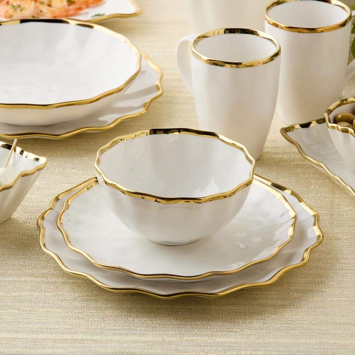 Керамический сервиз Regency Gold создан для тех, кто ценит утонченную классику в каждом движении ложки и чашки. Белоснежная поверхность с золотым кантом делает сервировку нарядной даже без повода. Фактурная керамика выглядит благородно и подчёркивает изысканность блюд на столе. В набор входит по 4 обеденные тарелки, 4 салатные тарелки, 4 пиалы и 4 чайные чашки — полноценный комплект на четверых. Посуда прочная, не впитывает запахи и остаётся яркой благодаря стойкой глазури. Такой сервиз — не просто посуда, а подарок стилю, настроению и гостеприимству.