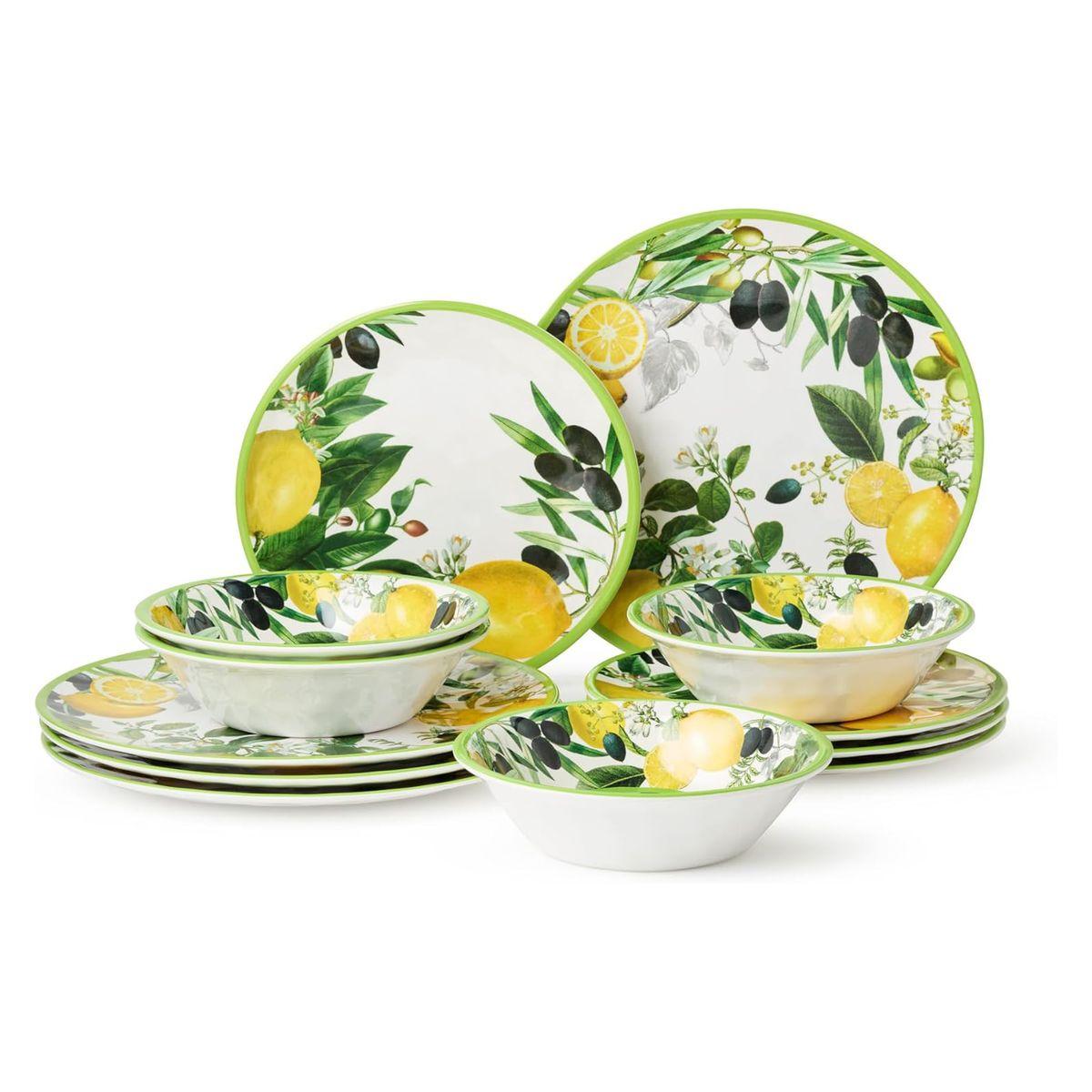 Яскравий сервіз «Лимони та оливки» Certified International перетворює кожну вечерю на сонячний середземноморський настрій. Соковиті лимони, оливкові гілки та свіжі відтінки зелені створюють відчуття літнього пікніка прямо вдома. Легкий і міцний меламін ідеально підходить як для щоденного використання, так і для сервірування на терасі або дачі. Набір розрахований на 4 особи і включає 12 предметів різного розміру. Такі тарілки не б'ються, легко миються і довго зберігають насиченість малюнка. Це сервіз, який дарує радість з першого погляду і робить кожен прийом їжі яскравою подією.