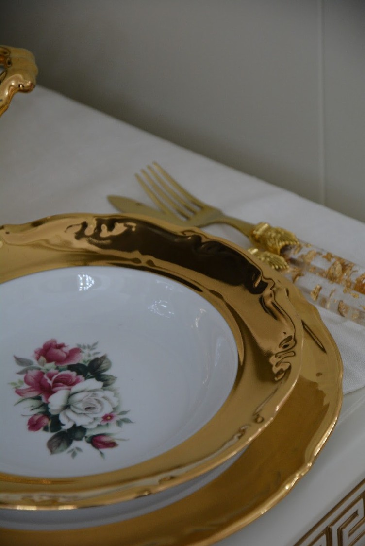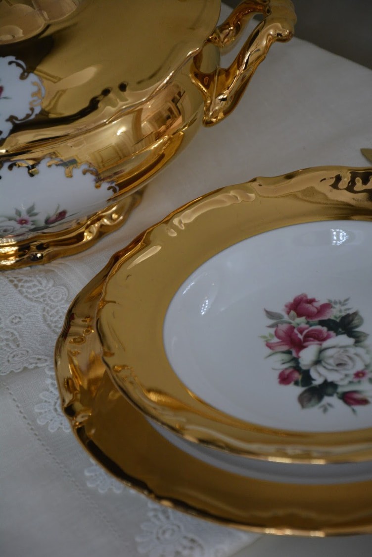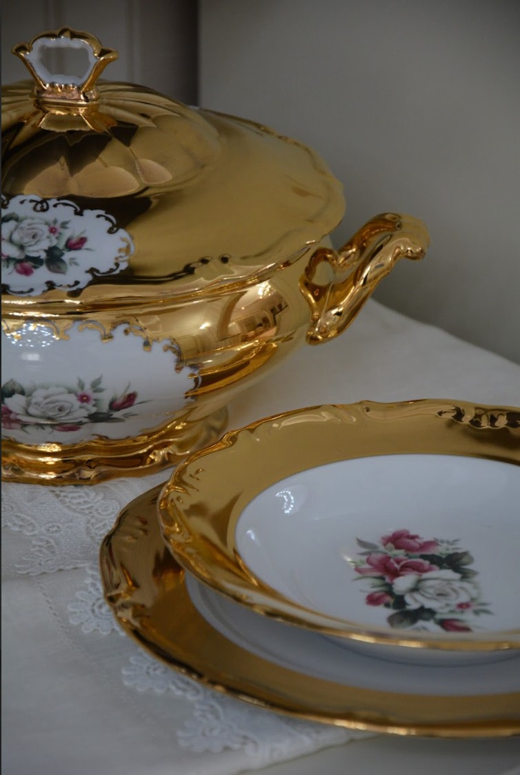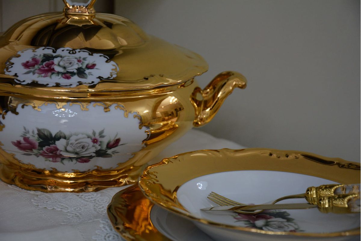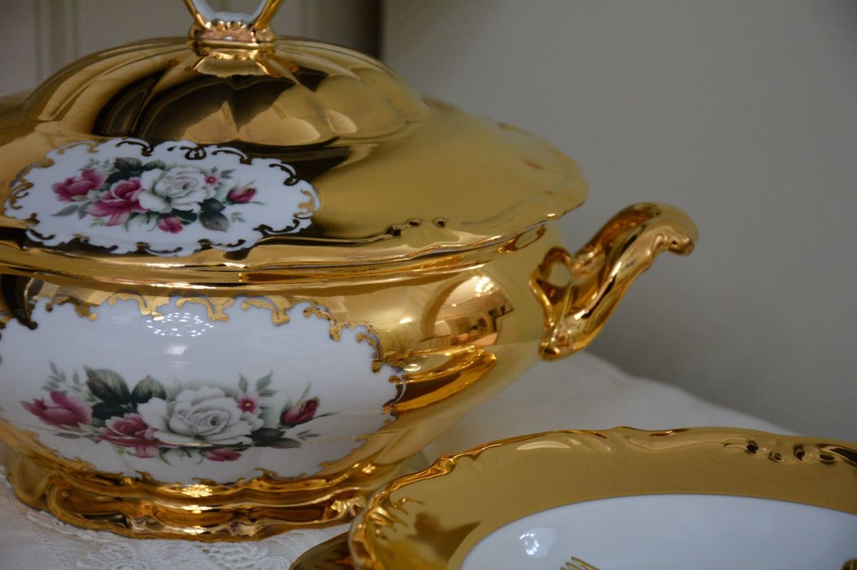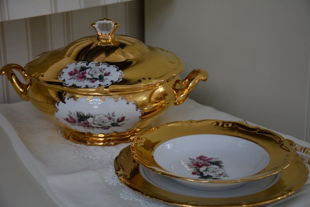Оригинальный итальянский столовый сервиз фарфоровый с супницей на 6 персон золотой Rose