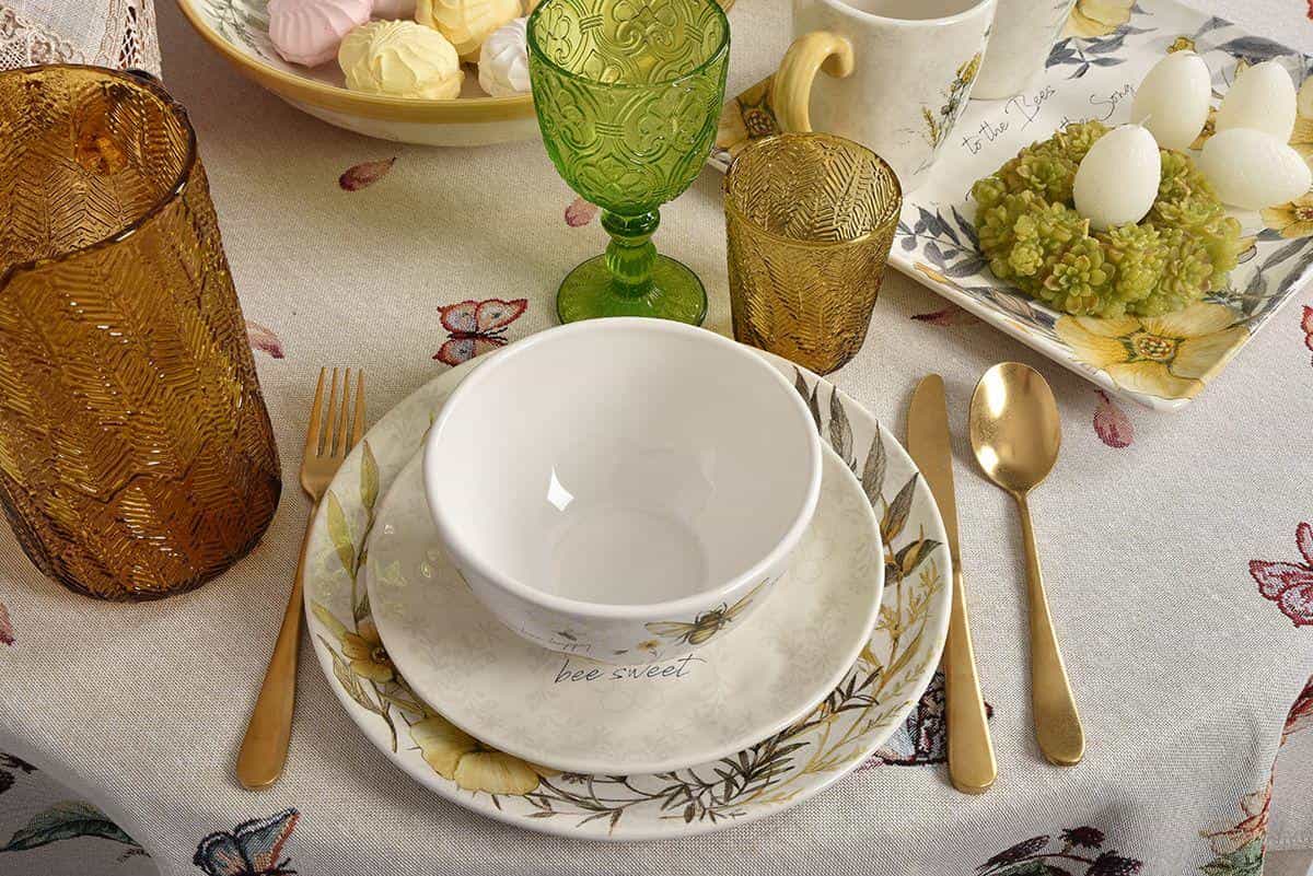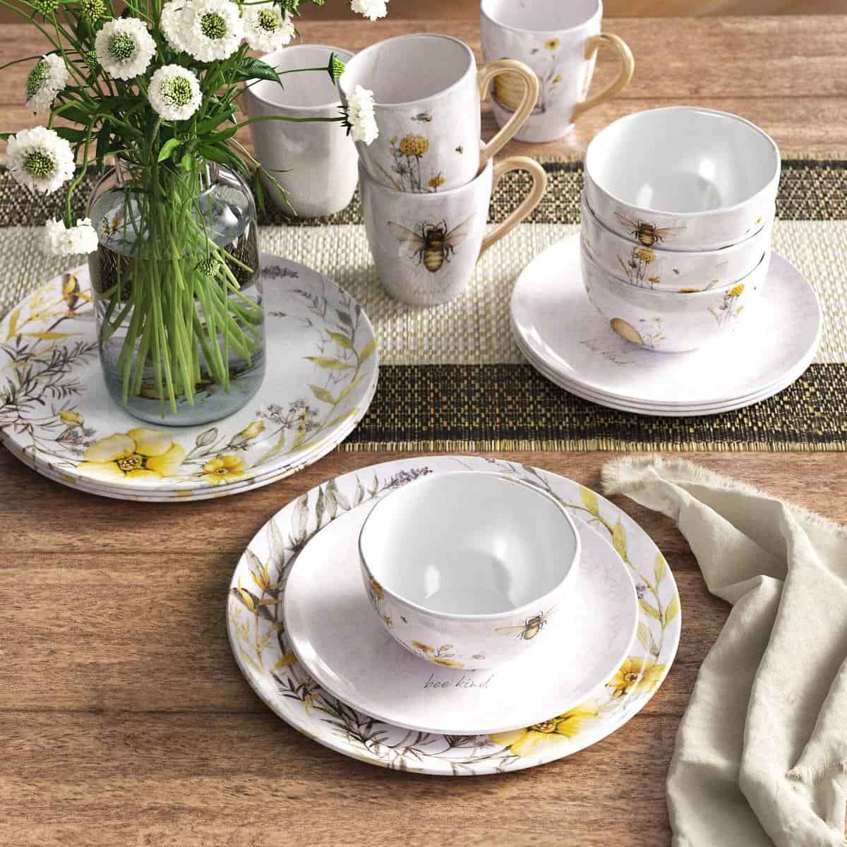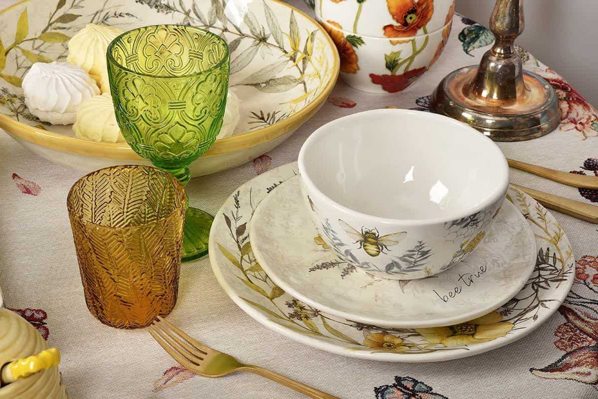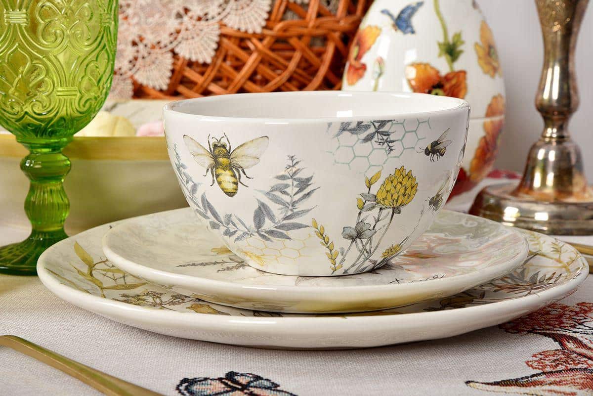 Керамическая посуда с удивительно нежным и добрым дизайном. Принтовый рисунок создан по авторскому эскизу художницы Сюзан Уингет, в котором гармонично сочетаются тонкая графика и прозрачная акварель, теплые тона и прохладные оттенки, изящные цветы и пухлые пчелки. Этот сервиз идеально комбинируется со светлой керамикой и текстилем в стиле прованс, а для более выразительной сервировки можно добавить цветное стекло.