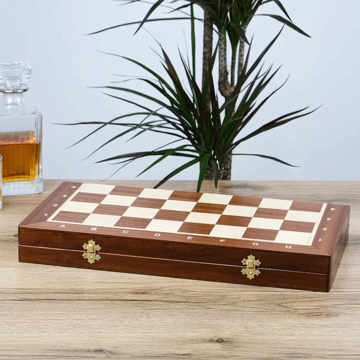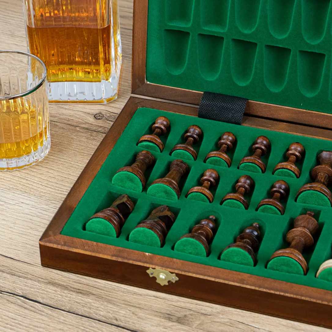 Дошка та фігури виготовлені з натурального дерева, а самі фігури зручно розміщуються всередині дошки.