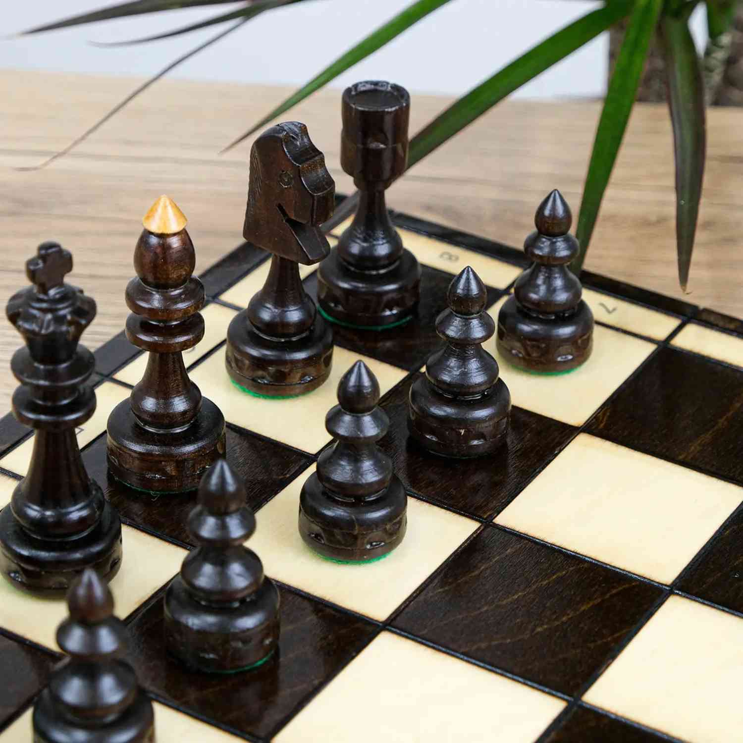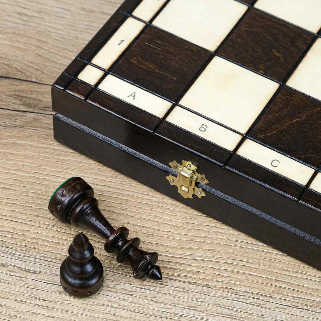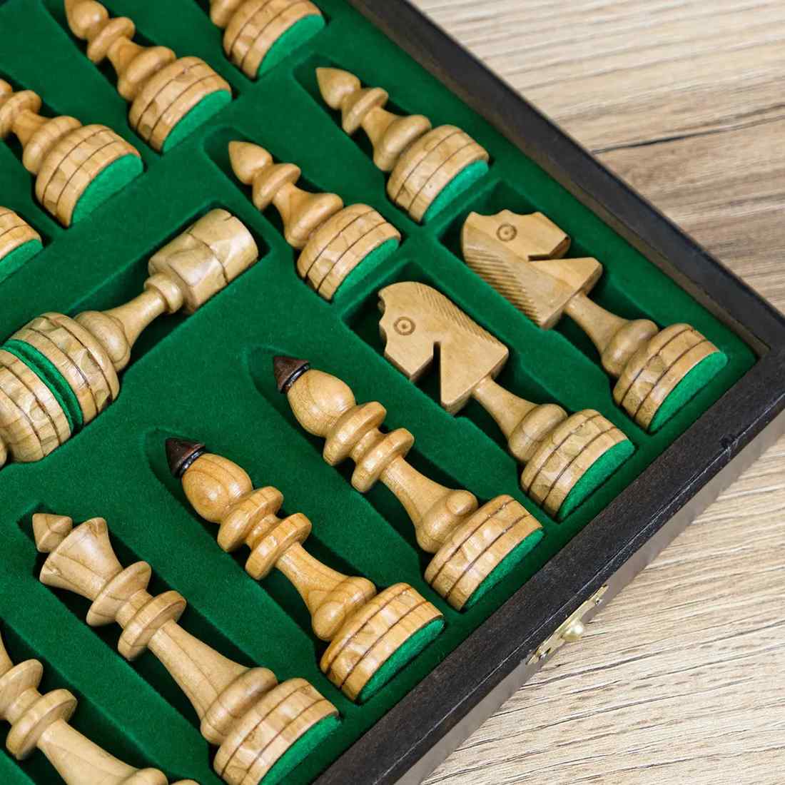 Дошка та фігури виготовлені з натурального дерева. Усередині передбачені спеціальні осередки, де фігури зручно та акуратно зберігаються.