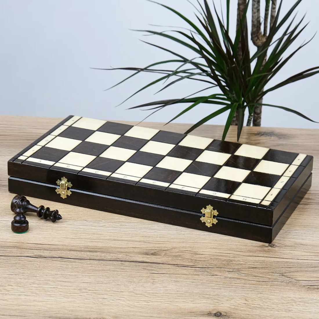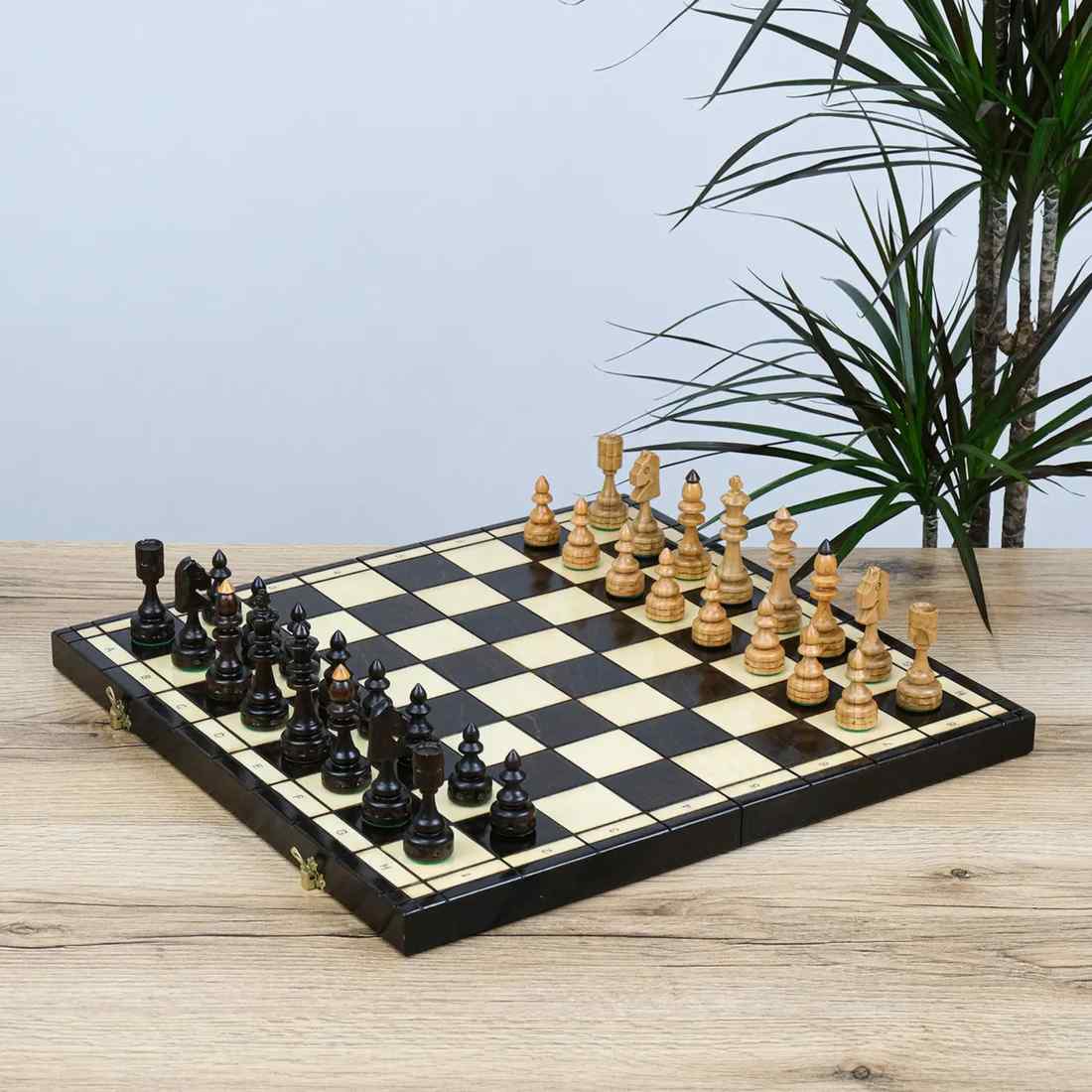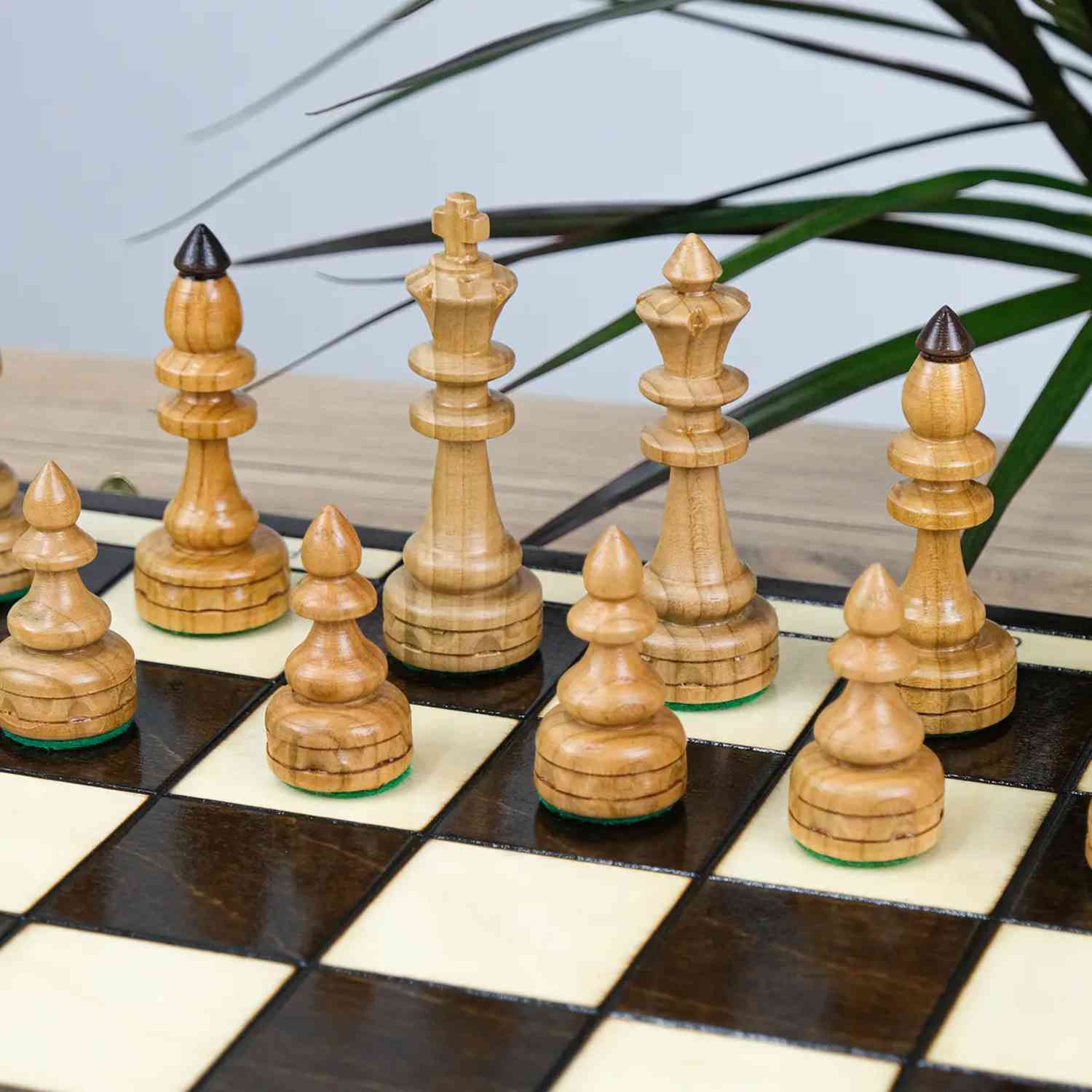 Дошка та фігури виготовлені з натурального дерева. Усередині передбачені спеціальні осередки, де фігури зручно та акуратно зберігаються.