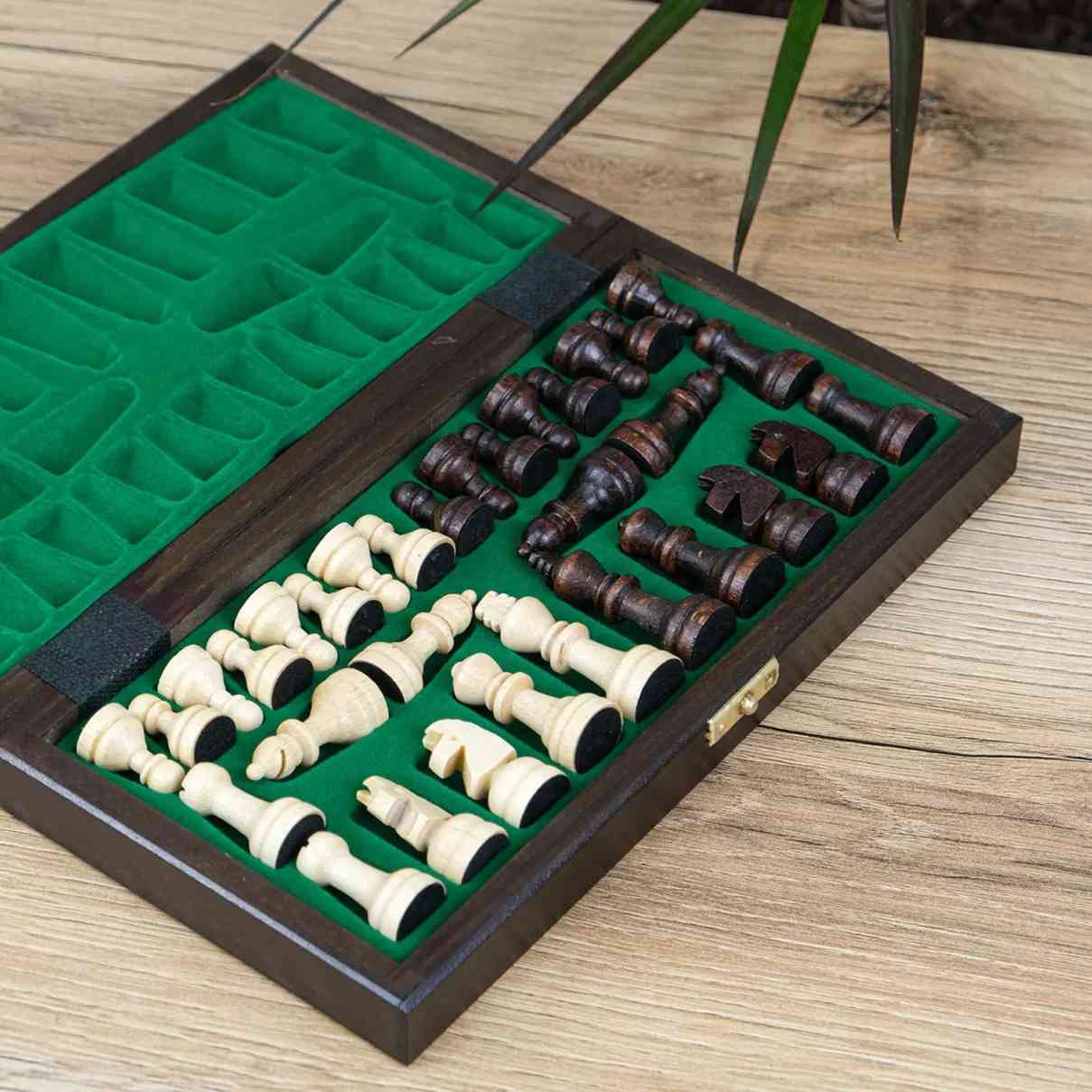 Набор изготовлен из натурального дерева: доска выполнена из берёзы и бука, а фигуры — из граба и бука. Игровое поле украшено декоративным выжиганием, а внутри предусмотрен удобный отсек для хранения фигур.