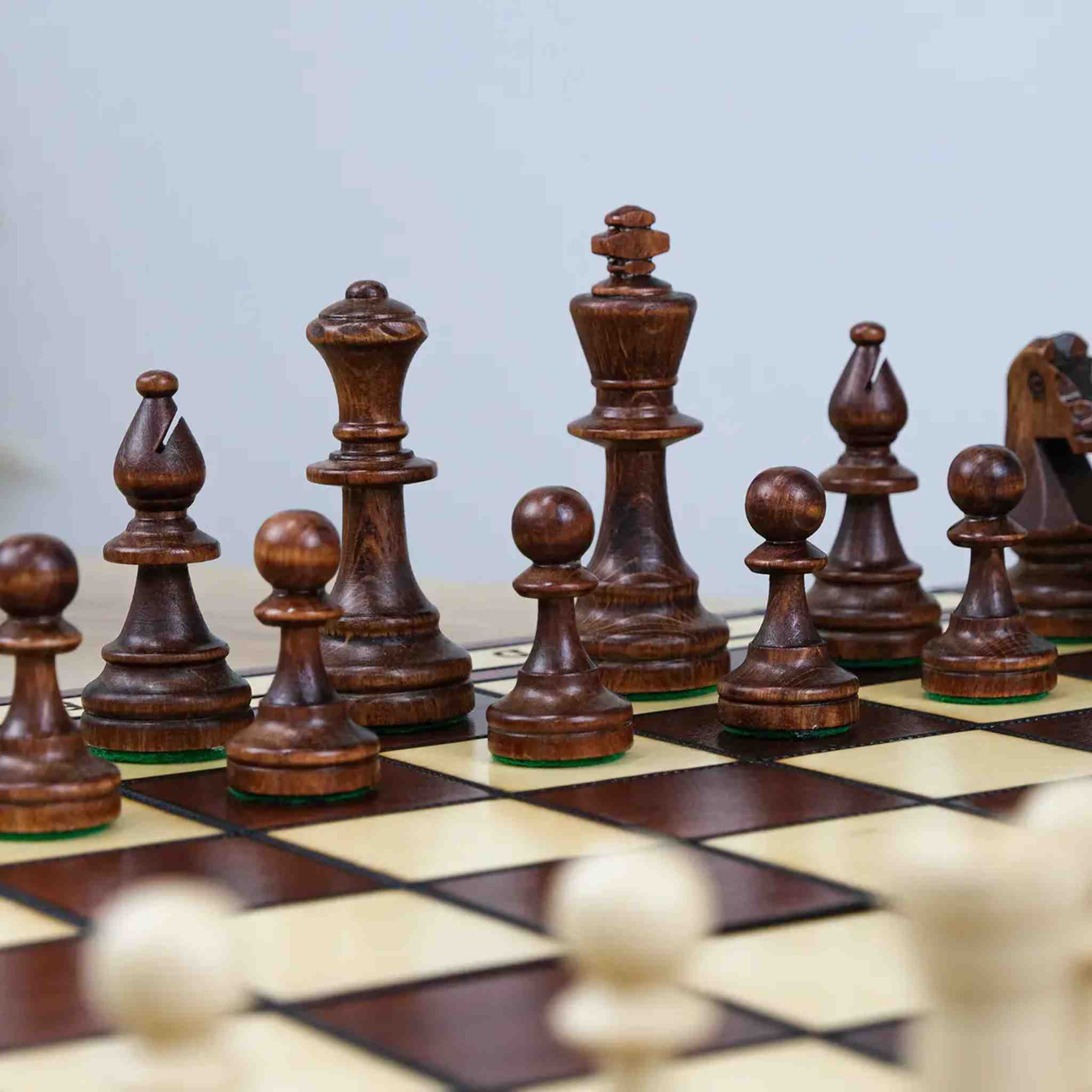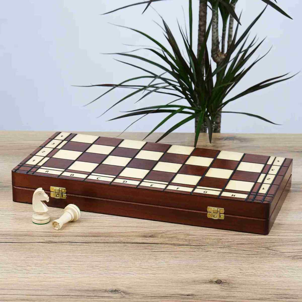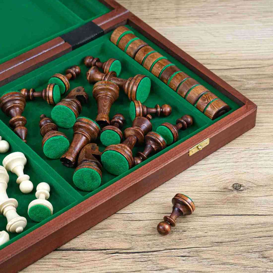 Дошка та фігури виготовлені з натурального дерева. Усередині передбачено зручне відділення для зберігання, де всі елементи розміщуються акуратно та безпечно.