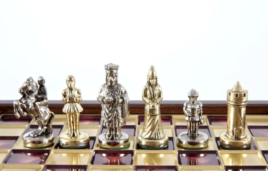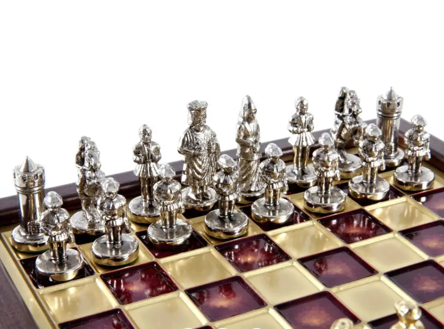 Металлические фигуры выполнены в византийском стиле, с чётко выраженными силуэтами, а сама доска оформлена в благородном бордовом цвете с изящной патиной. Набор излучает атмосферу древности, спокойной силы и утончённой эстетики.