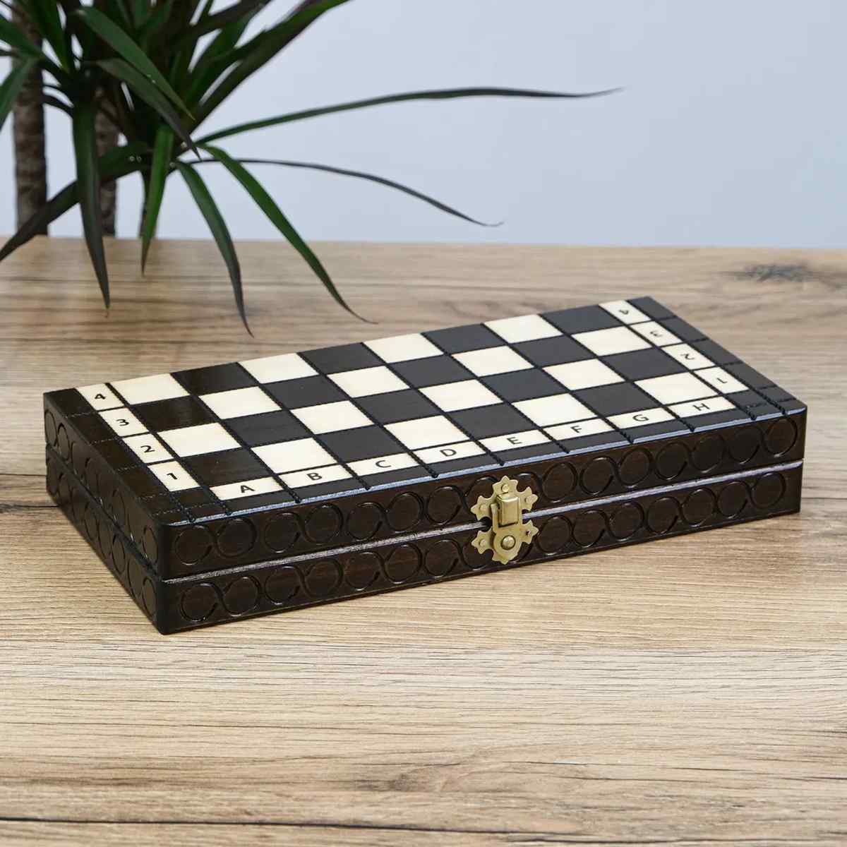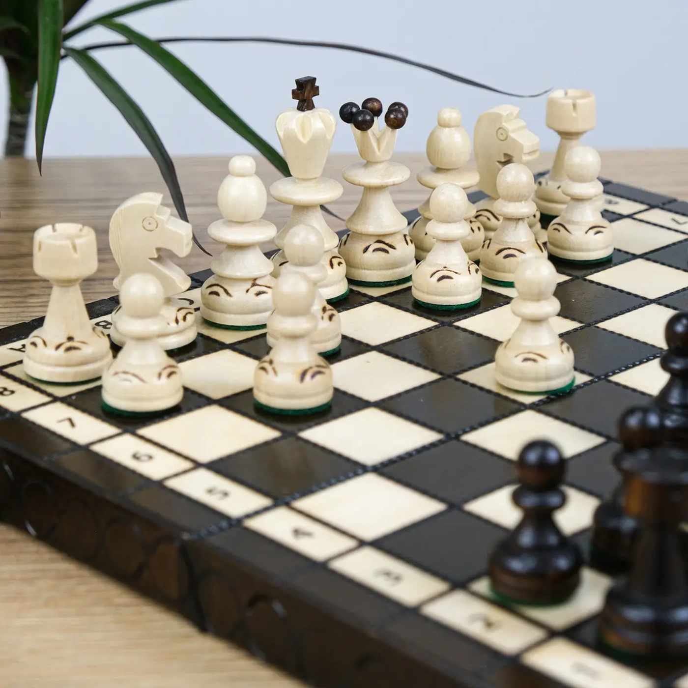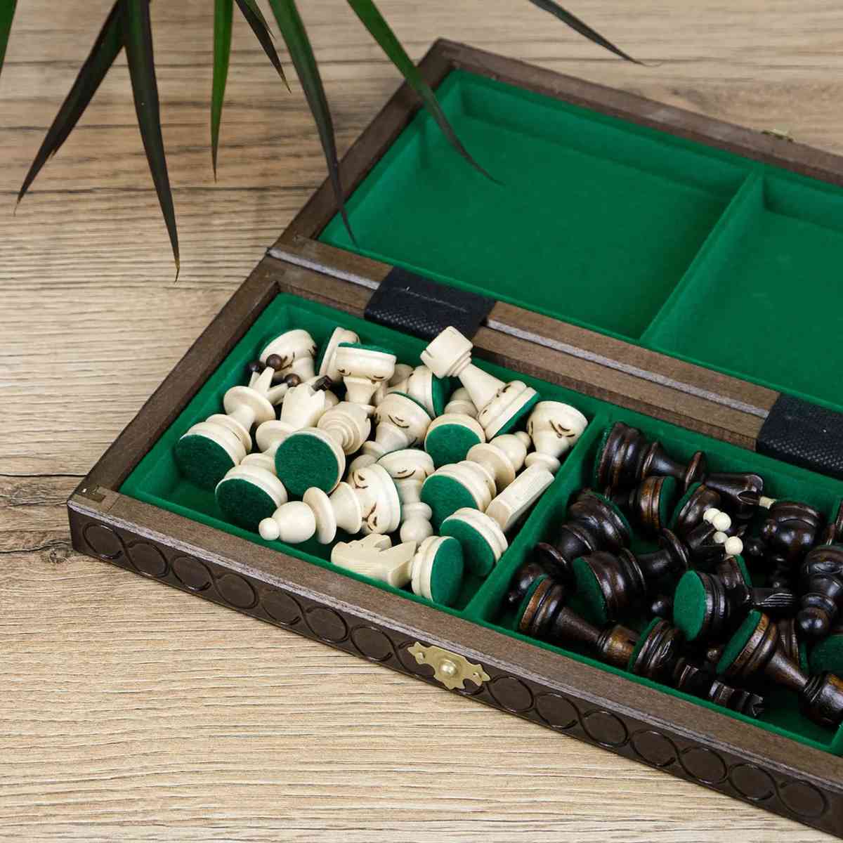 Дошка та фігури виготовлені з натурального дерева. Усередині передбачено зручне місце для зберігання, де фігури акуратно впорядковані та захищені.