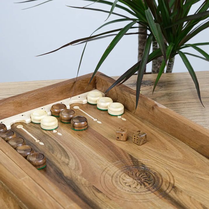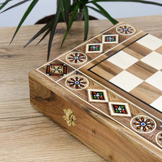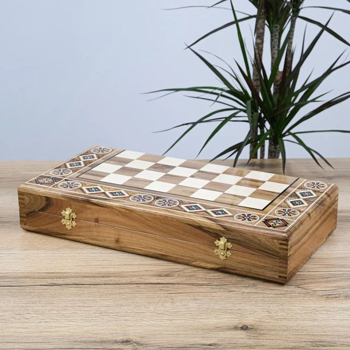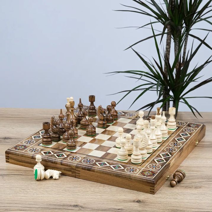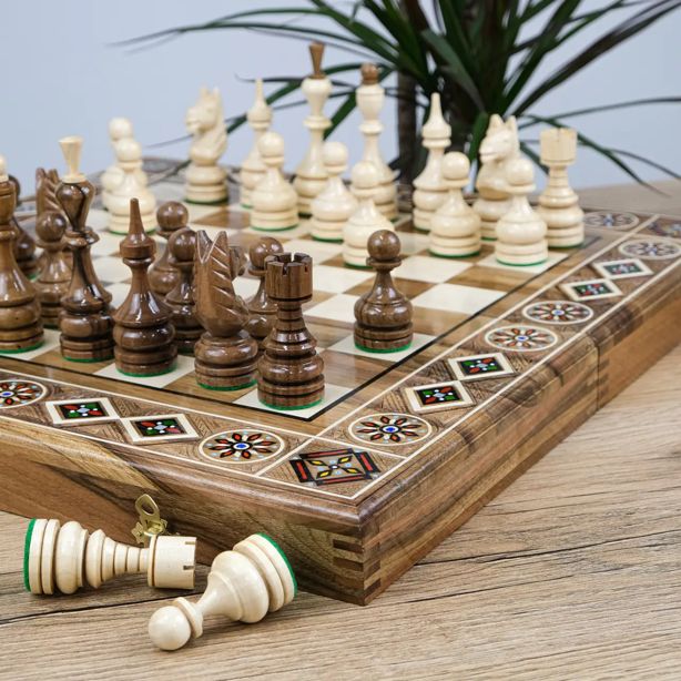 Игровая доска выполнена из натурального дерева с выразительной многослойной текстурой и украшена декоративными вставками с перламутровым эффектом, которые элегантно обрамляют игровое поле. Фигуры выполнены в классическом стиле в контрастных оттенках — тёмно-коричневом и светло-кремовом, дополнены аккуратной резьбой, подчёркивающей их изящный внешний вид.