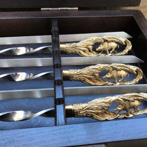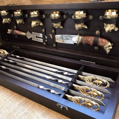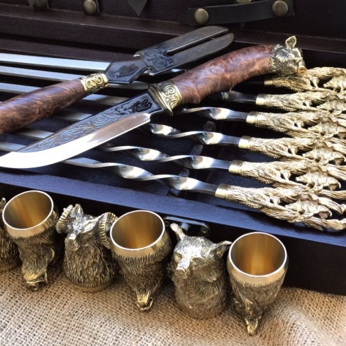 1. Шампура 6 шт с рукоятью из бронзы, выполненные методом вакуумного литья и покрытые теплостойким лаком. Шампур изготовлен из пищевой нержавеющей стали 12х18Н10Т. Толщина металла шампура 10х3 мм.