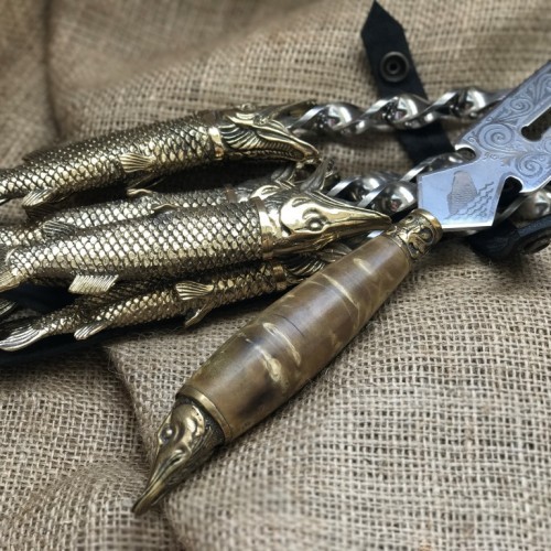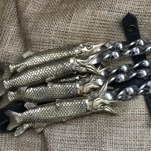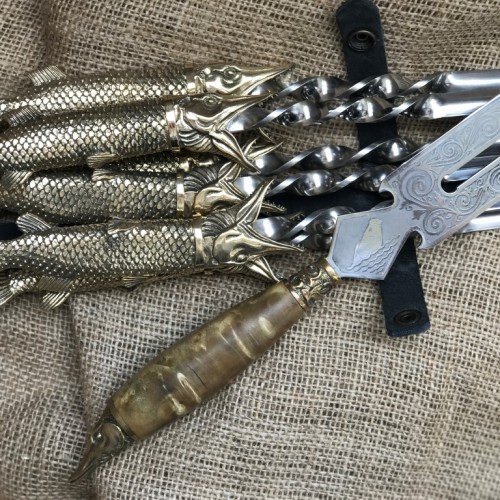 Шампура 6 штук, твердая пищевая нержавеющая сталь толщиной 3мм. Г-образные. Рукоять: ювелирное художественное литье из бронзы в виде щуки (при использовании ручка не нагревается).