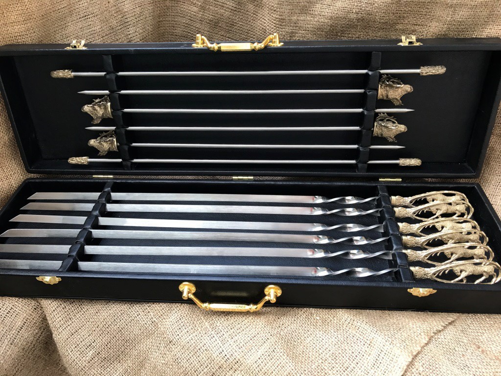 1. Шампура: 6 штук. Жесткая пищевая нержавеющая сталь толщиной 3 мм. Г-образные. Рукоятка: ювелирное художественное литье из бронзы. При использовании ручка не нагревается.