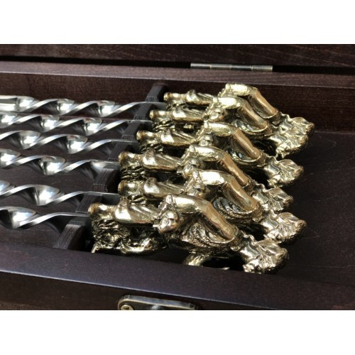 Кейс из массива бука. Шампура с рукоятью из бронзы,выполненные методом вакуумного литья покрытые теплостойким лаком, шампур изготовлен из пищевой нержавеющей стали 12Х18Н10Т, толщина металла шампура 10х3мм. Общая длинна шампура с ручкой 70см, Длинна шампура 60см -6шт