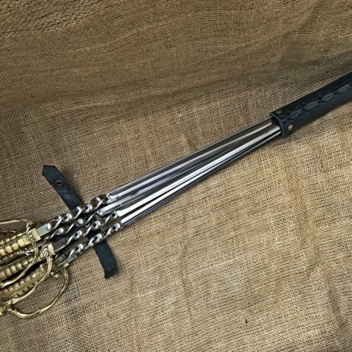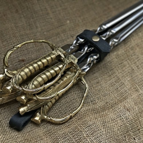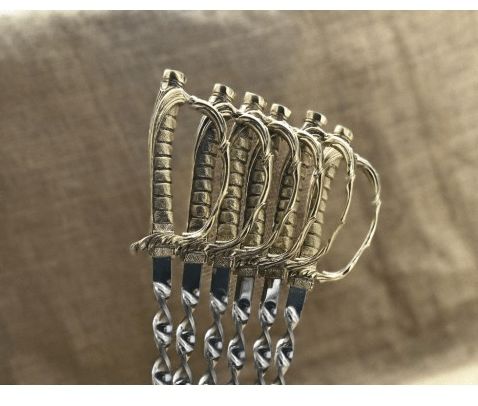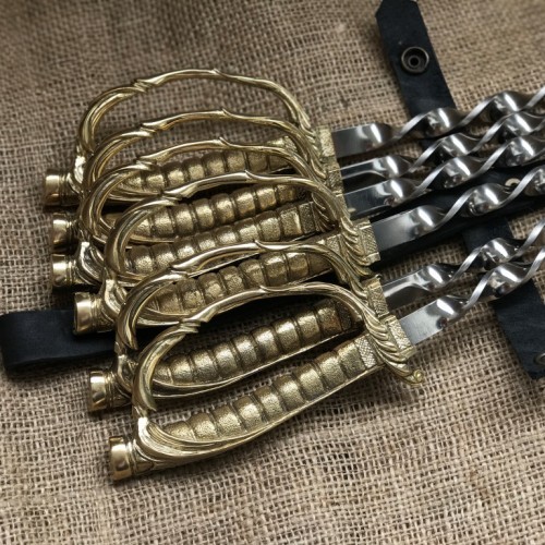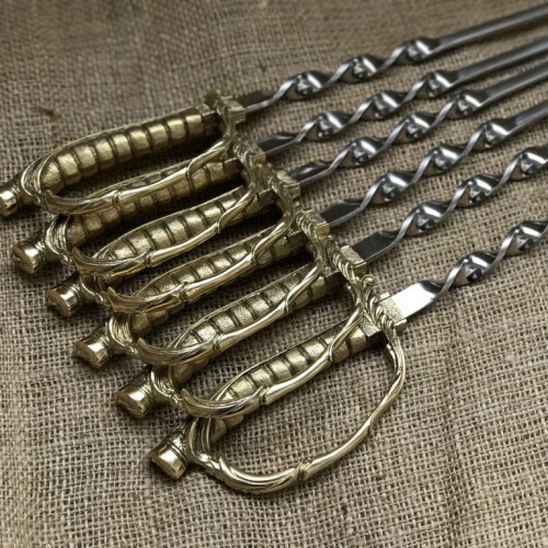Шампура в виде шпаги: 6 штук, жесткая пищевая сталь нержавеющая толщиной 3 мм. Г-образные Длина шампура: общая – 69 см; рабочая – 50 см Рукоятка: ювелирное художественное литье из бронзы (при использовании ручка не нагревается).