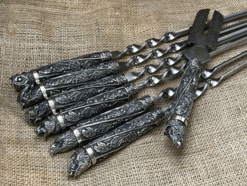 Шампура с рукоятью из мельхиора,выполненные методом вакуумного литья покрытые теплостойким лаком. Шампур изготовлен из пищевой нержавеющей стали 12х18Н10Т, толщина металла шампура 10х3мм. Г-образный клинок.