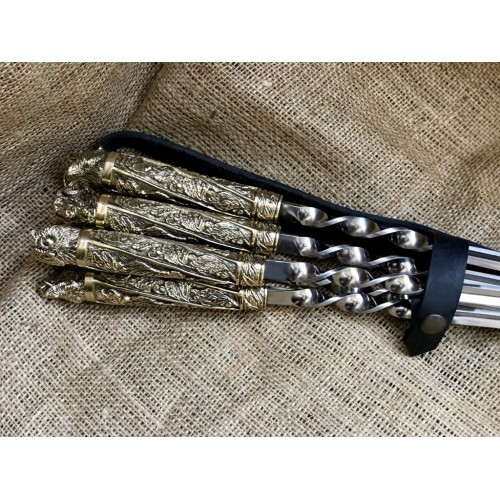 1. Шампура с рукоятью из бронзы,выполненные методом ювелирного вакуумного литья покрытые теплостойким лаком, шампур изготовлен из пищевой нержавеющей стали 12Х18Н10Т, толщина металла шампура 12х3мм, Г-образный клинок. Общая длинна шампура с ручкой 69см, Длинна шампура 59см.