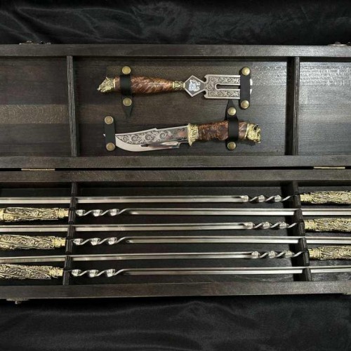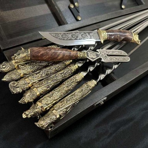 4. Шампура: 6 штук, жесткая пищевая нержавеющая сталь толщиной 3 мм. Длина шампура: общая – 69 см; рабочая -45 см Рукоятка: ювелирное художественное литье из бронзы (при использовании ручка не нагревается).