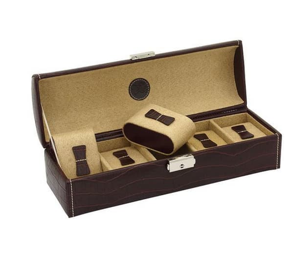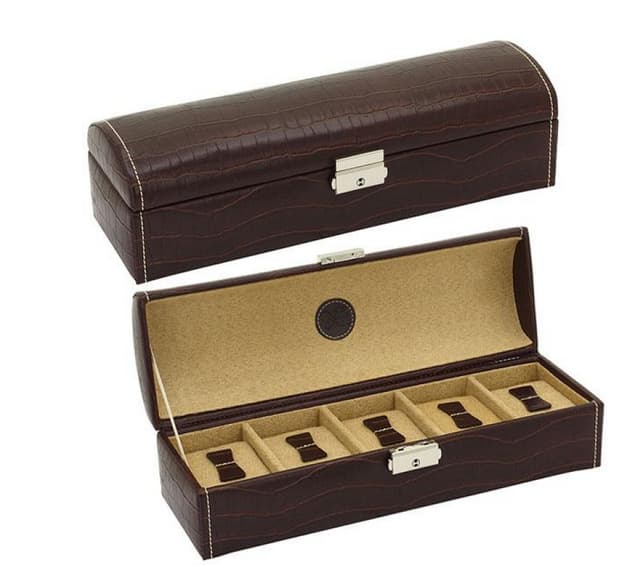 Скринька для годинника із зовнішнім оздобленням з високоякісної екошкіри кроко коричневого кольору. Всередині оздоблення виконане із світло-бежевого велюру. П'ять відділень із подушечками для зберігання годинників. Розмір комірок 5 x 8 x 3 cm. Закривається на замку.