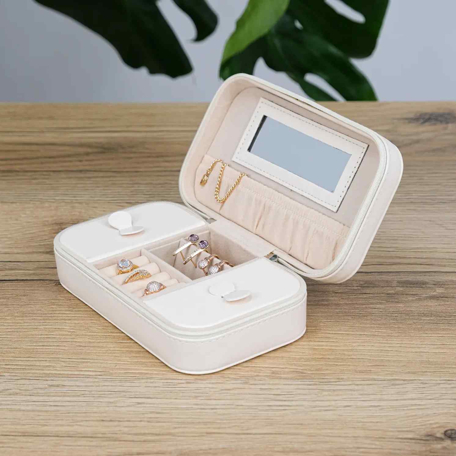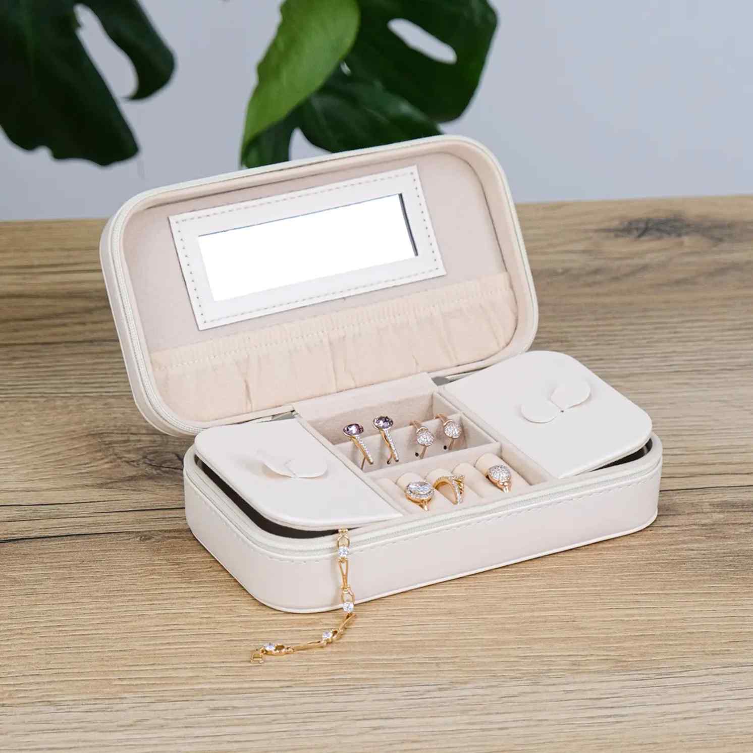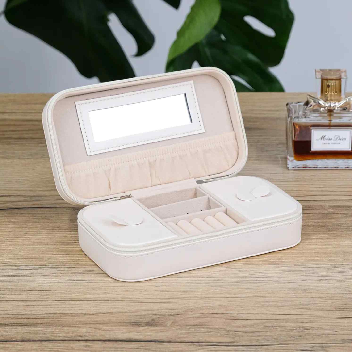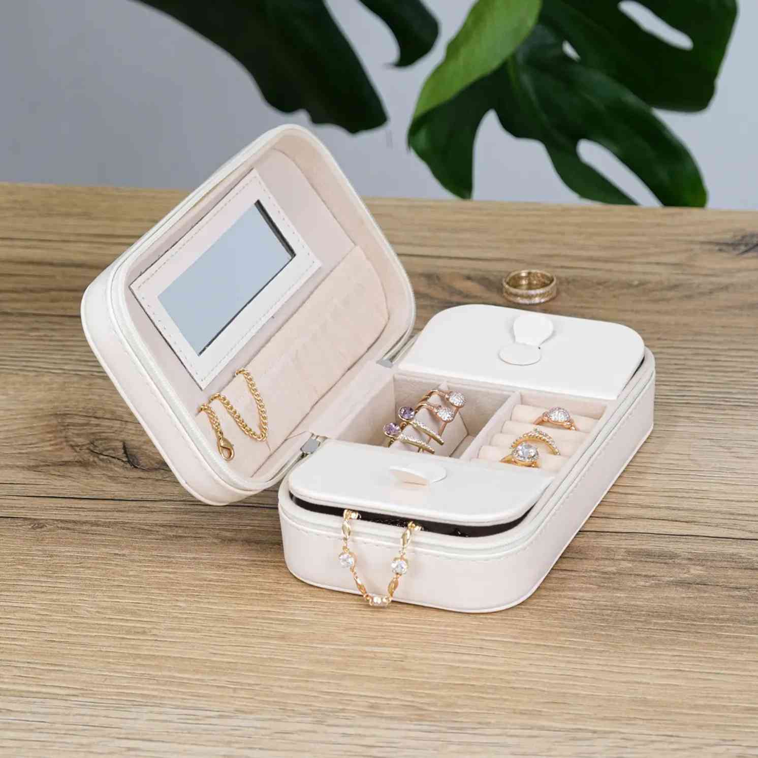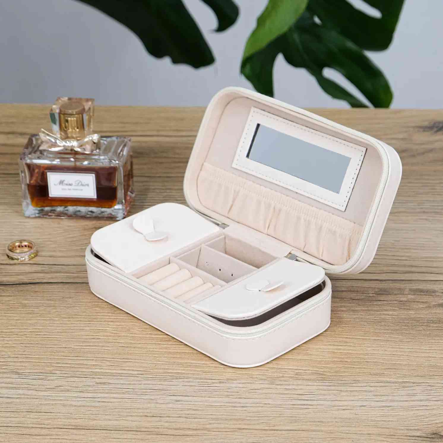 Всередині все організовано інтуїтивно: відділення не перевантажують, а направляють. Каблучки, сережки, ланцюжки — кожна річ має свій простір без зайвої метушні. Вбудоване дзеркало — це не просто деталь, а швидкий контроль перед виходом: відкрити, подивитися, обрати і закрити. Формат продуманий так, щоб скринька легко поміщалася у сумку, валізу чи на полицю, не займаючи зайвого місця.