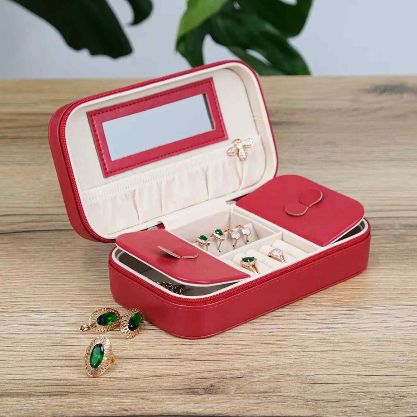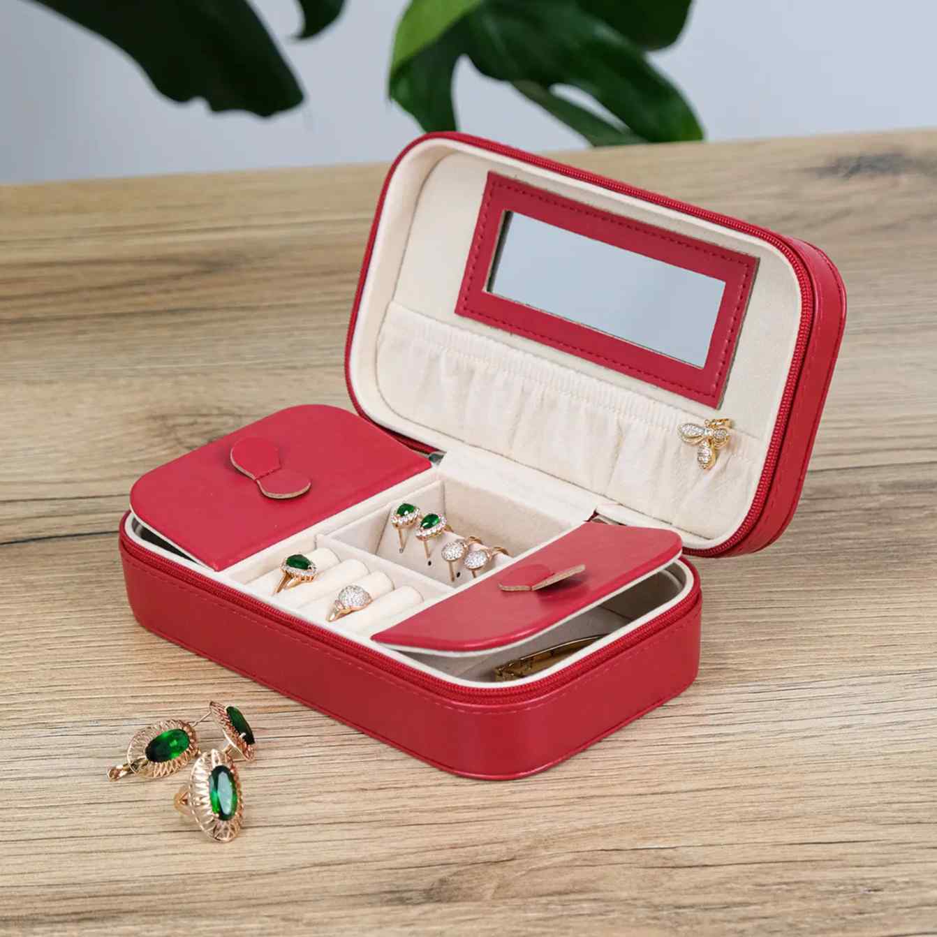 Всередині все організовано інтуїтивно: відділення не перевантажують, а направляють. Каблучки, сережки, ланцюжки — кожна річ має свій простір без зайвої метушні. Вбудоване дзеркало — це не просто деталь, а швидкий контроль перед виходом: відкрити, подивитися, обрати і закрити. Формат продуманий так, щоб скринька легко поміщалася у сумку, валізу чи на полицю, не займаючи зайвого місця.