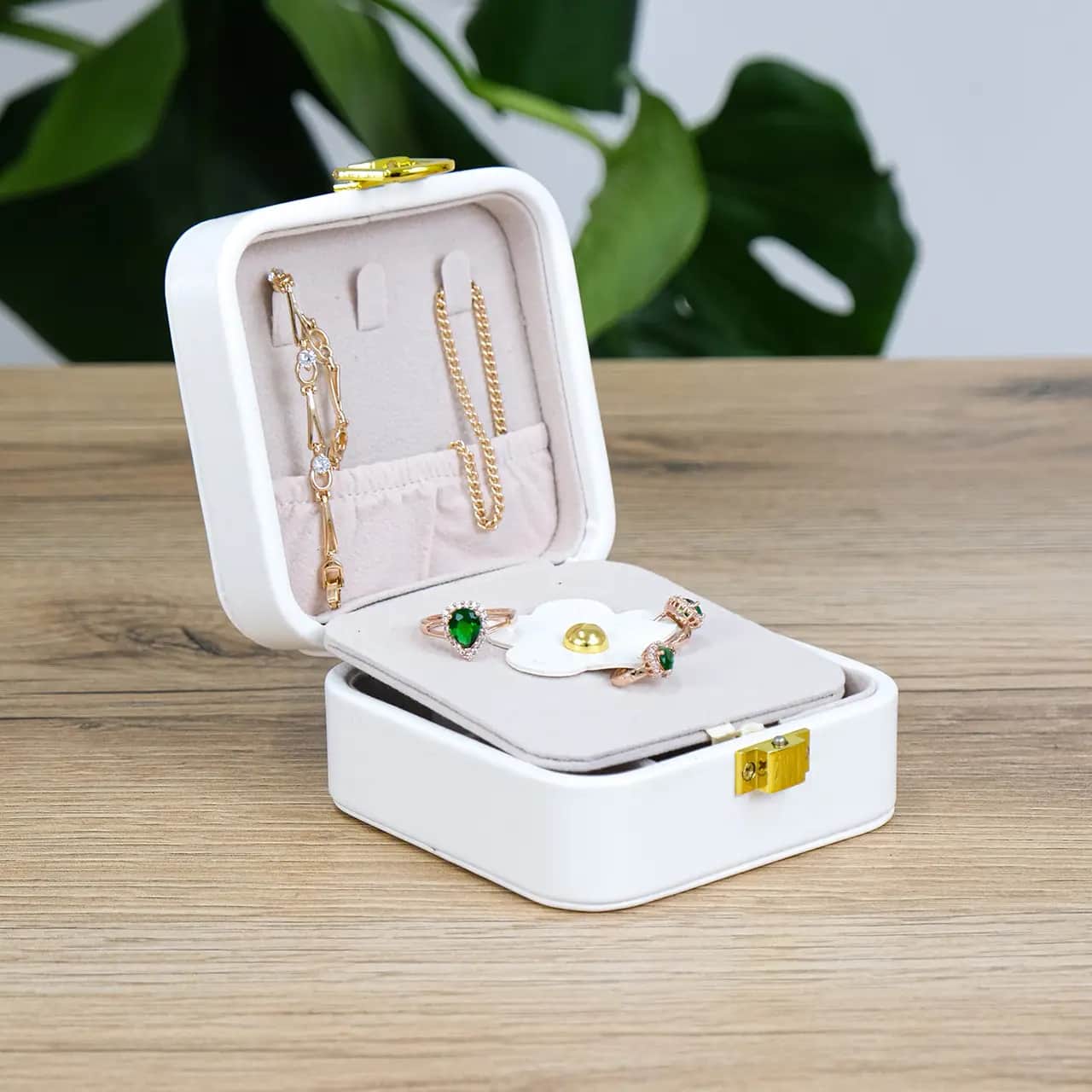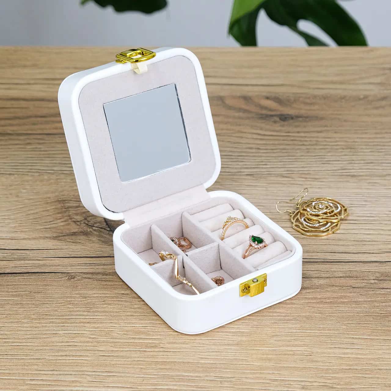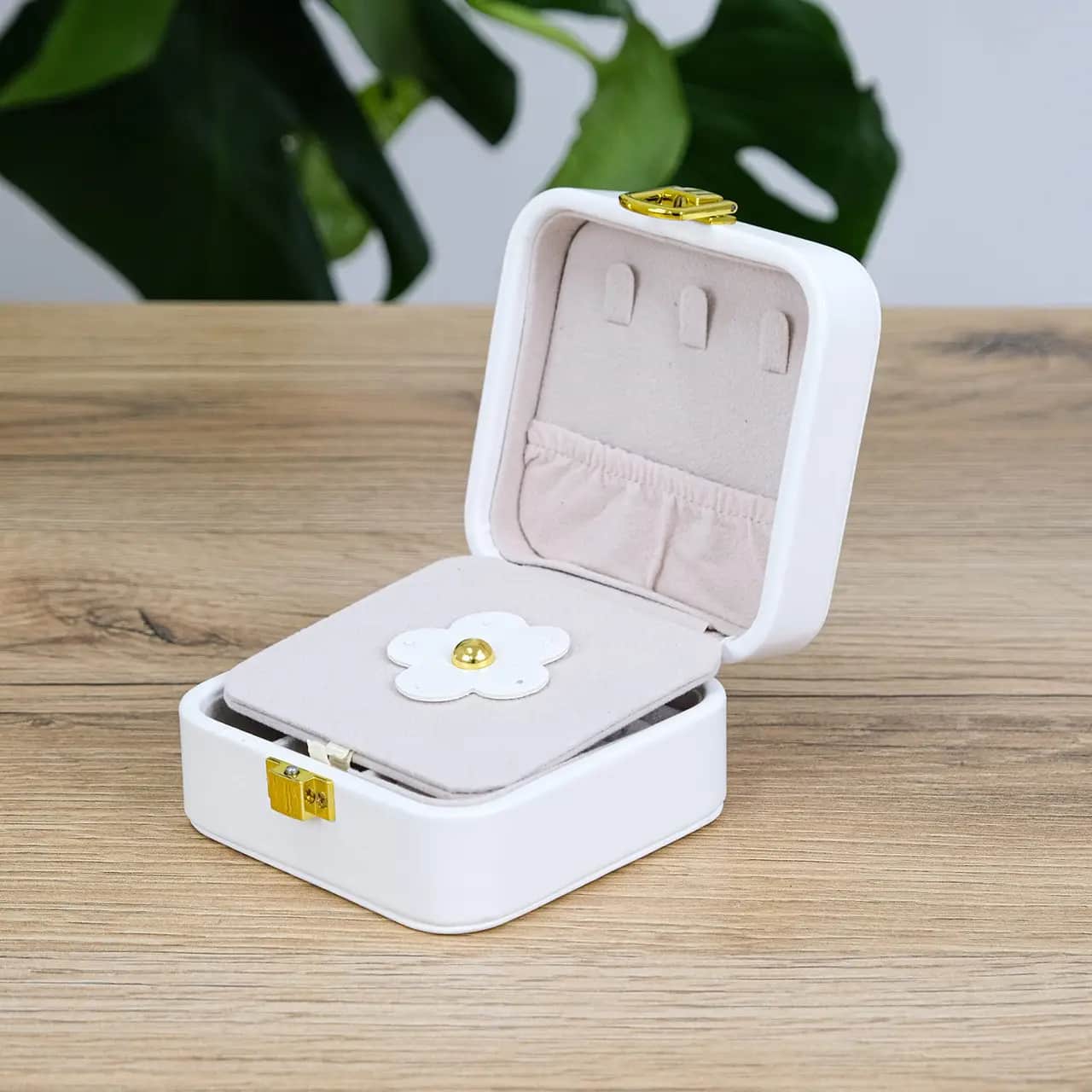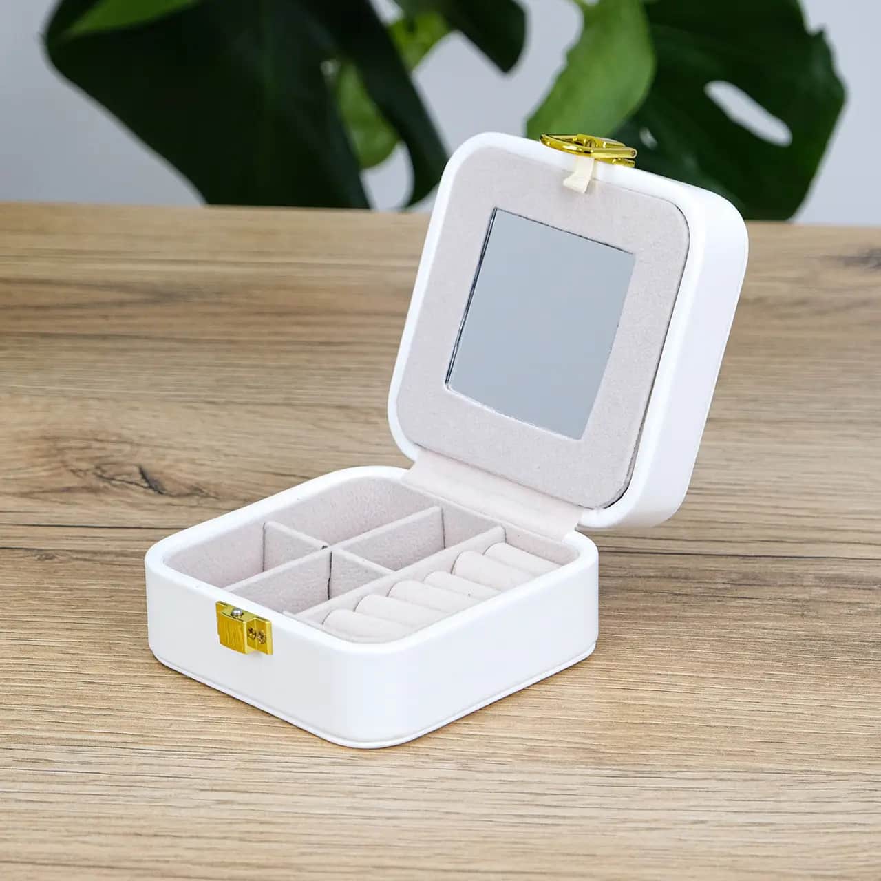 Эта миниатюрная шкатулка для украшений — идеальный формат для тех, кто ценит порядок даже в мелочах. Выполненная из аккуратной белой экокожи, она выглядит свежо, стильно и универсально, легко вписываясь в любой интерьер или дорожный набор. Компактный размер делает её незаменимой в поездках — любимые украшения всегда будут рядом и в безопасности.