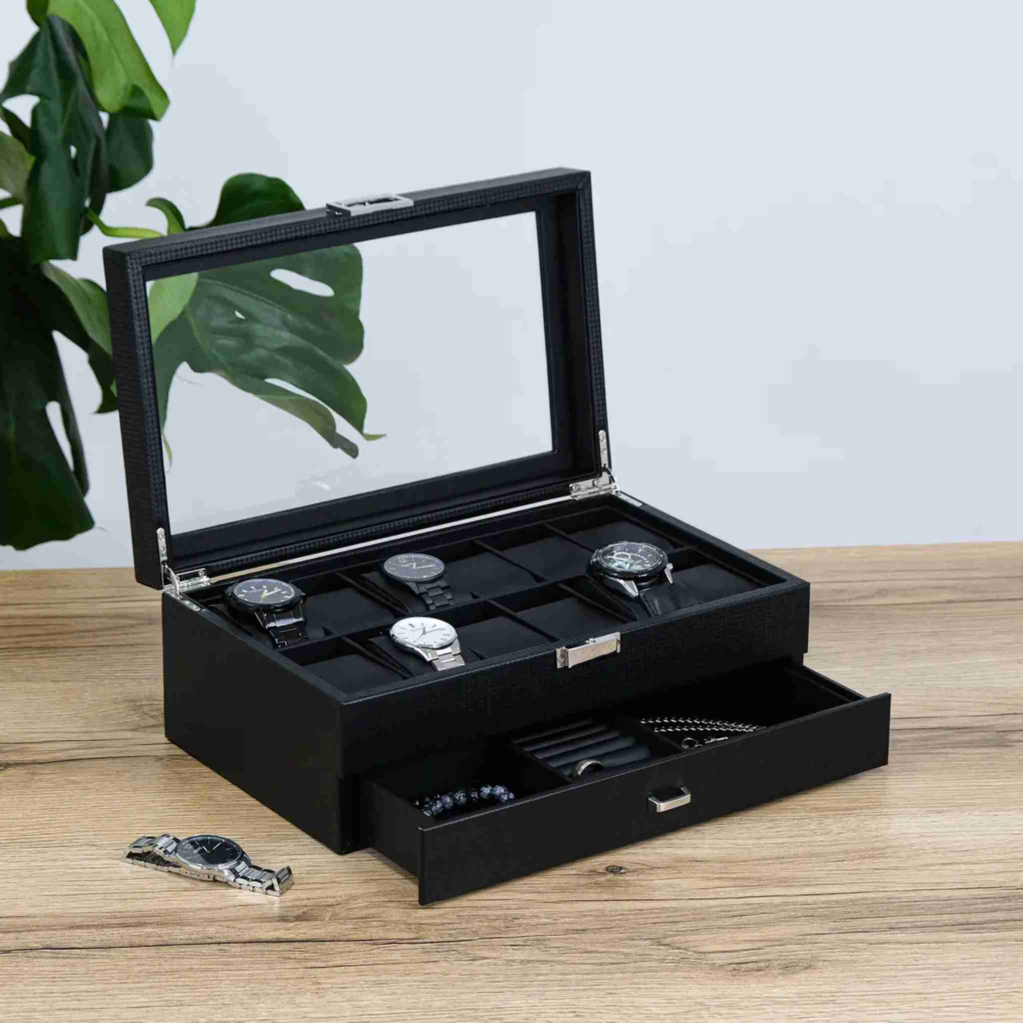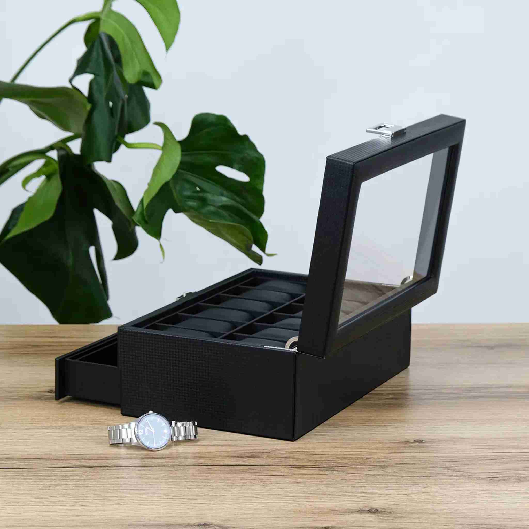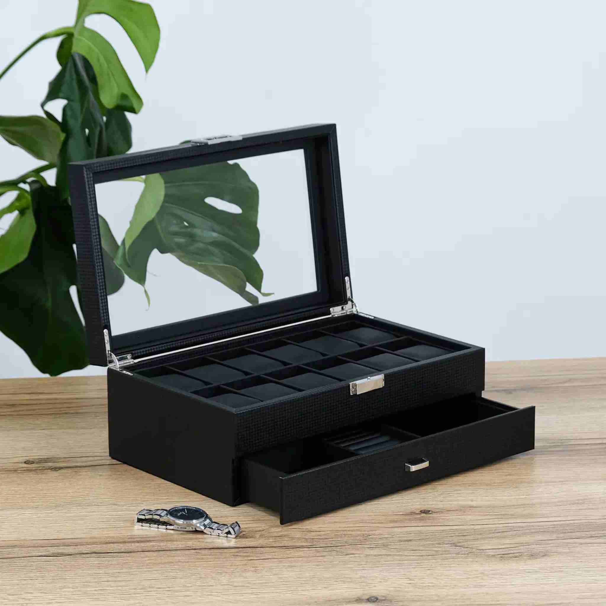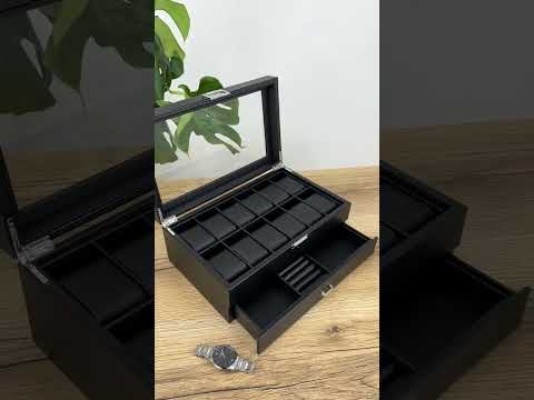 Продумана конструкція передбачає два рівні зберігання: верхній ярус із м’якими подушечками надійно фіксує годинники, захищаючи їх від подряпин і зміщення, а нижній висувний ящик забезпечує додатковий простір для аксесуарів, ремінців або інших важливих дрібниць. Внутрішнє оздоблення виконане з делікатного матеріалу, що дбайливо зберігає ваші речі в ідеальному стані.