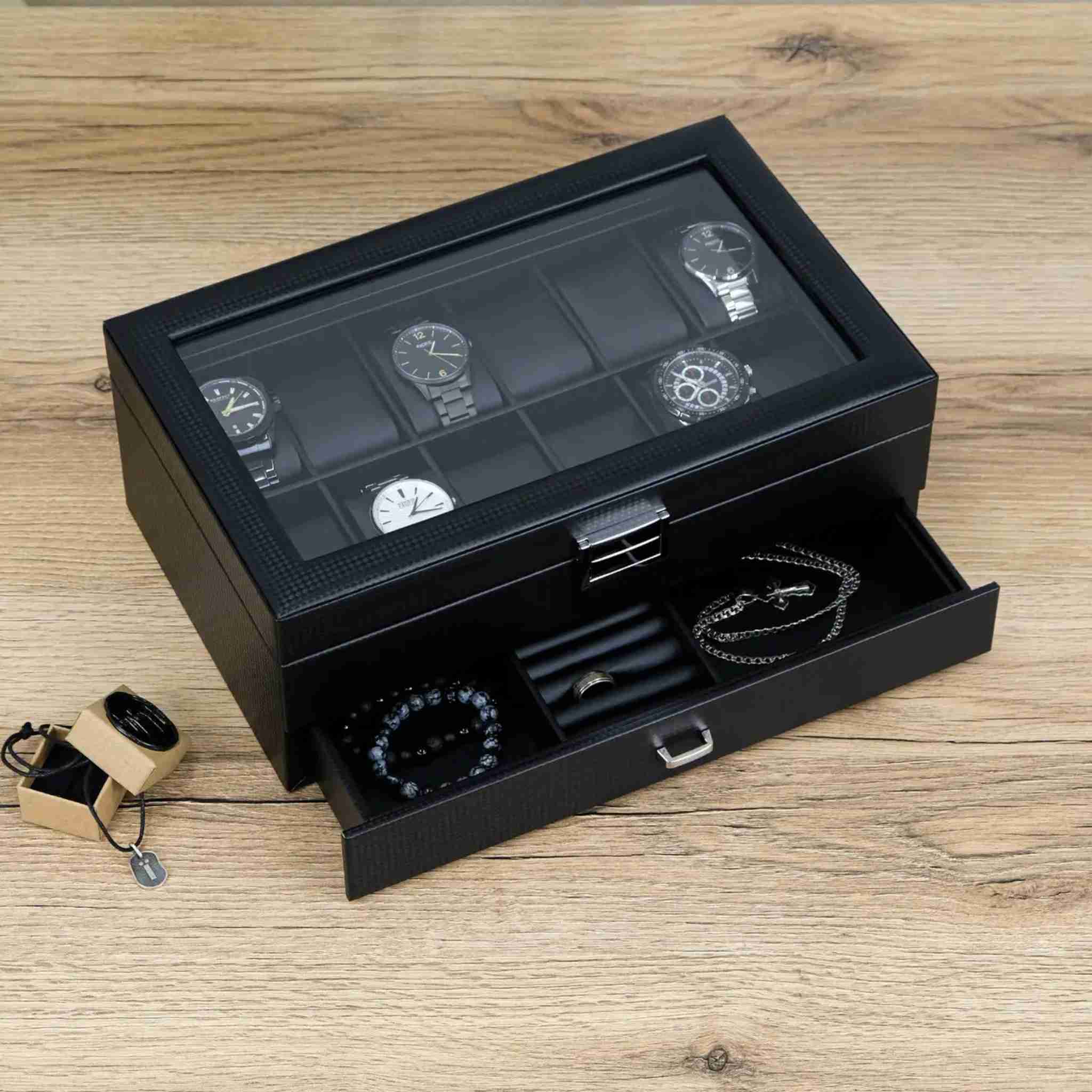 Перед вами стильна двоярусна скринька-органайзер для годинників, створена для тих, хто цінує порядок і увагу до деталей. Глибокий чорний колір екошкіри надає виробу стриманого та сучасного вигляду, який гармонійно доповнить будь-який інтер’єр — від класичного до мінімалістичного. Прозора кришка дозволяє швидко оглянути вміст, додаючи зручності у щоденному користуванні.