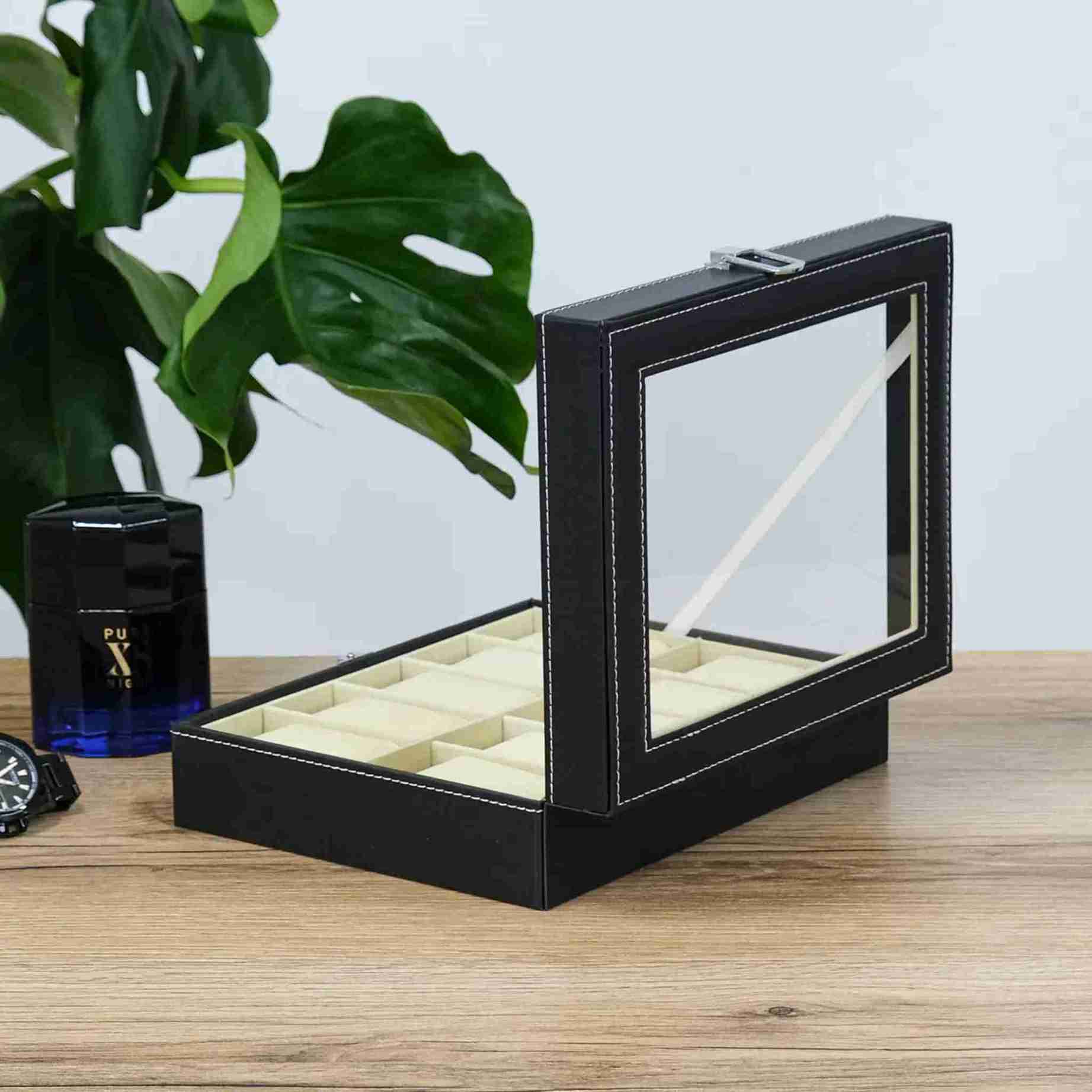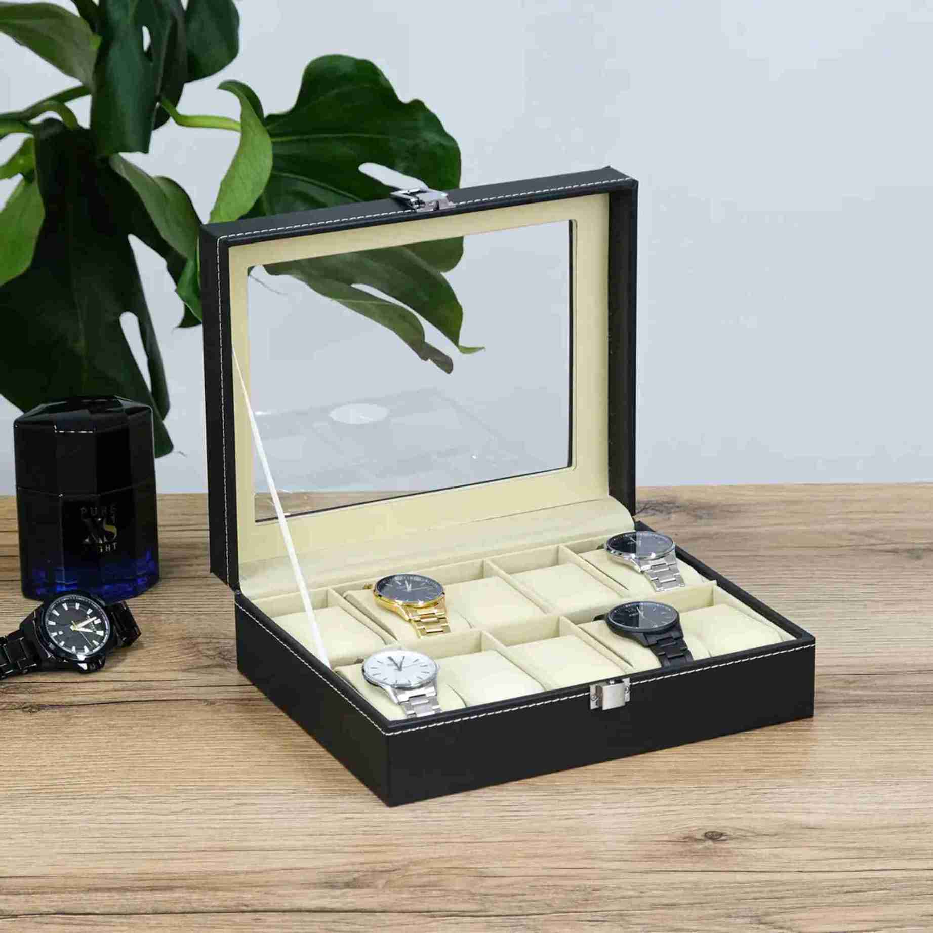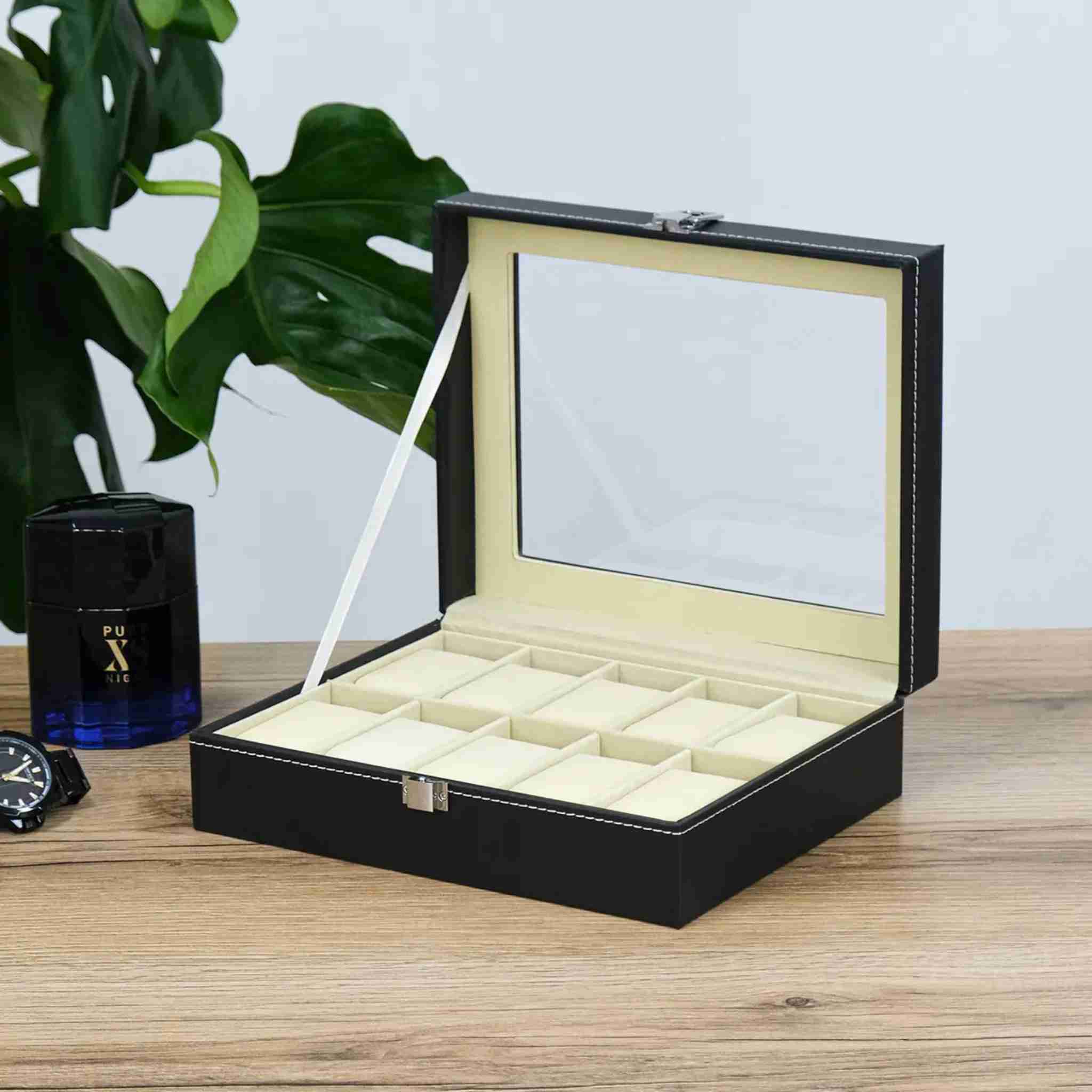 Внутрішній простір ретельно продуманий: десять окремих осередків із м’якими подушечками надійно фіксують годинники, захищаючи їх від подряпин, пилу та контакту між собою. Світла внутрішня оббивка створює ефект контрасту, завдяки чому кожен годинник виглядає ще більш виразно та презентабельно. Такий органайзер чудово підходить як для щоденного використання, так і для зберігання цінних моделей.
