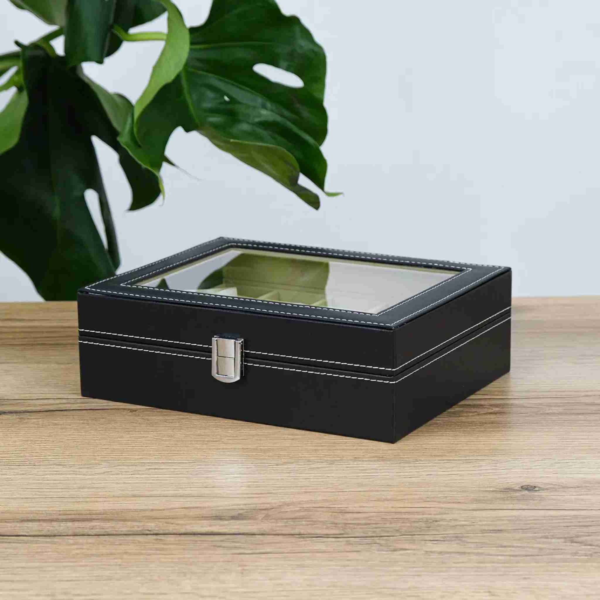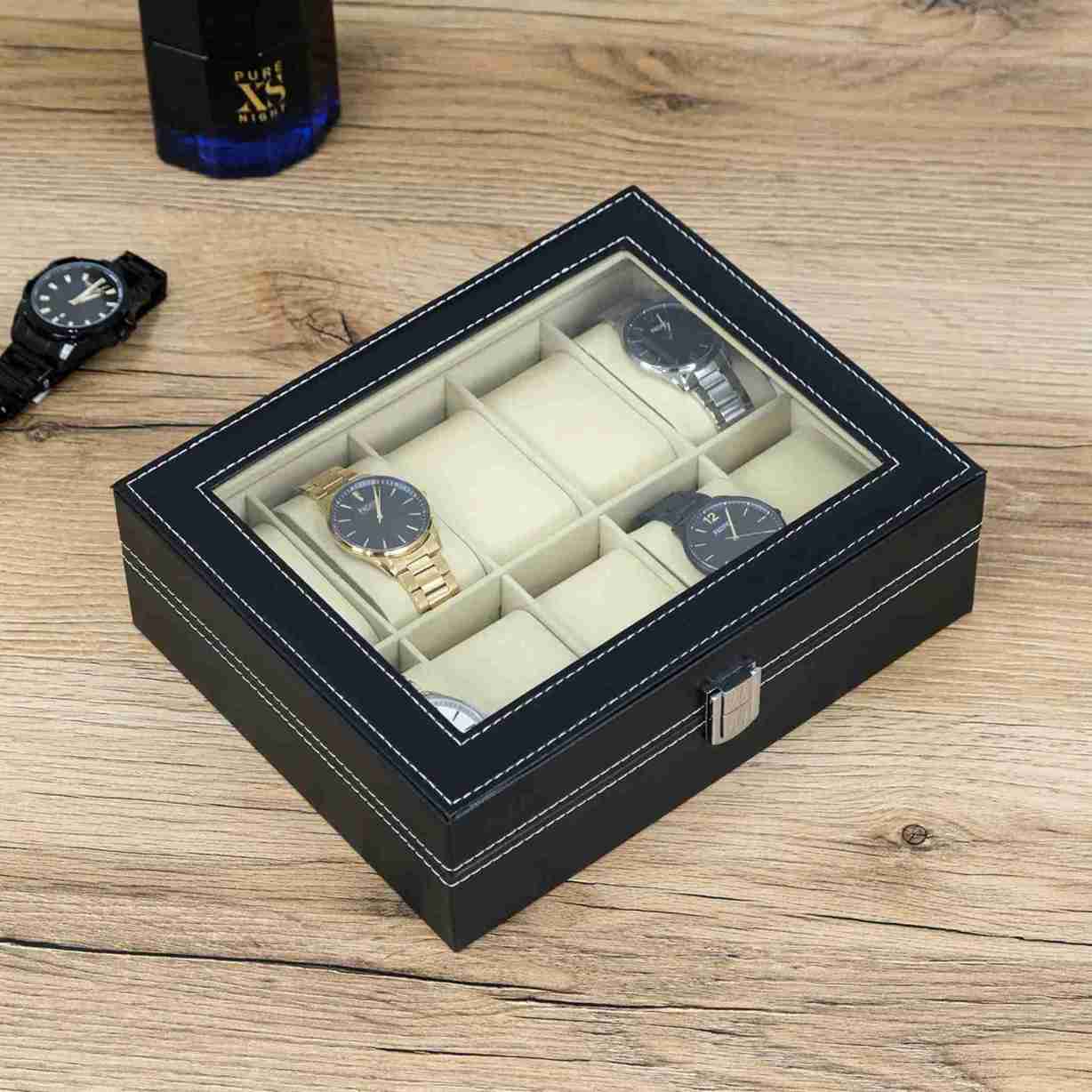 Шкатулка-органайзер для годинників чорна з екошкіри 10 відділень Noble Storage