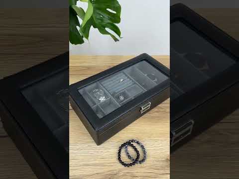 Продуманное внутреннее пространство включает четыре отдельных секции для часов, специальный блок для колец, серёг или запонок, а также дополнительные отделения для браслетов, цепочек и других мелочей. Прозрачная крышка позволяет легко просматривать содержимое, не открывая органайзер.