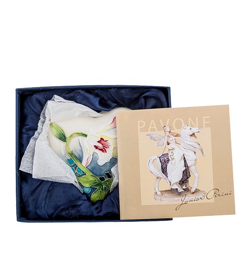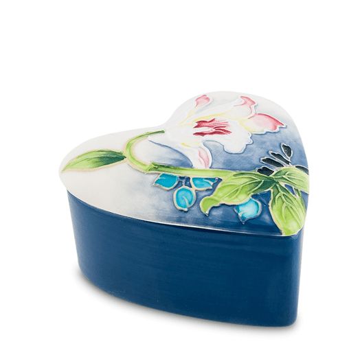Скринька «Серце» стане оригінальним місцем зберігання прикрас. Візуально скринька виконана в забарвленні, схожій на оксамит скриньки для обручок, що змушує зануритися в спогади, що хвилюють, або у власні мрії. Доповнює картину оригінальна квіткова композиція на кришці фарфорової скриньки, що ефектно поєднується із загальною кольоровою гамою. Приємно дивує рельєф візерунка, додаючи приємних емоцій під час її використання.