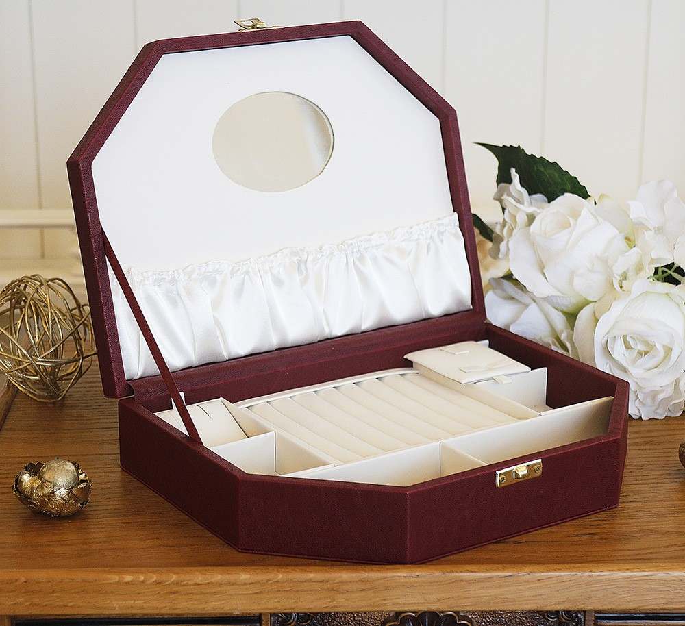 Коробка имеет форму квадратной шкатулки. Внутреннее наполнение разделено на четыре части, но с оптимальным размером: три отделения различной формы без отделений для крупных украшений, одно отделение с роликами для запонок и сережек.