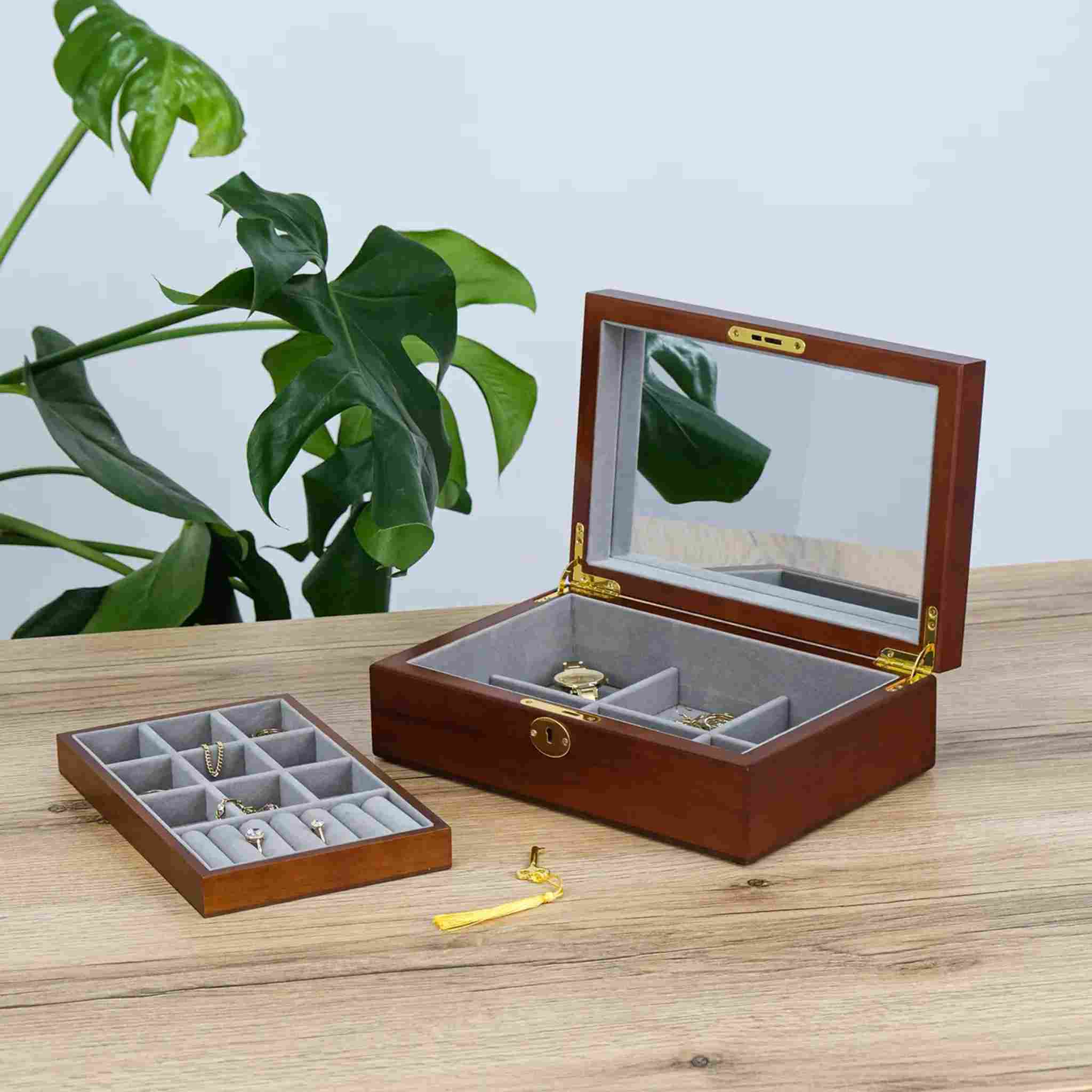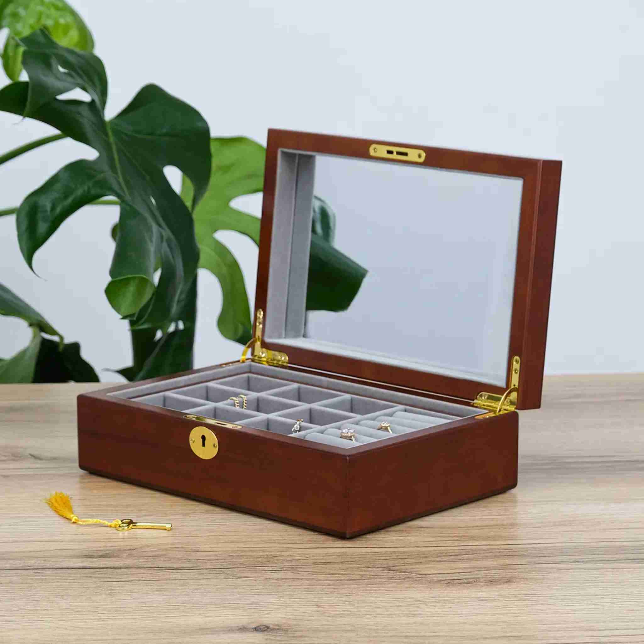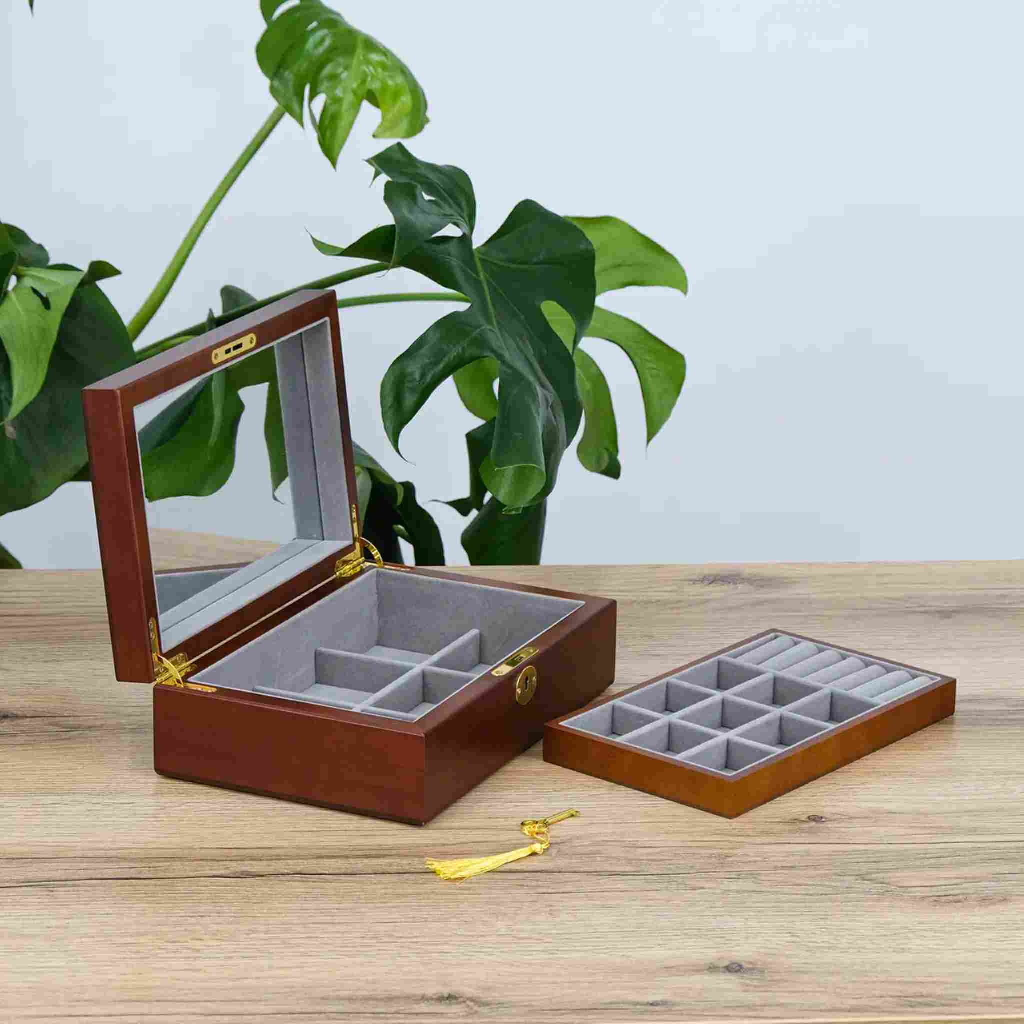 Ця компактна дерев’яна скринька для прикрас — вдалий вибір для тих, хто прагне порядку та дбайливого зберігання улюблених аксесуарів. Насичений коричневий відтінок дерева виглядає стримано й елегантно, додаючи відчуття надійності та гармонії в інтер’єрі. Кришка з дзеркалом робить використання максимально зручним — ви можете одразу оцінити свій образ і швидко обрати прикраси.