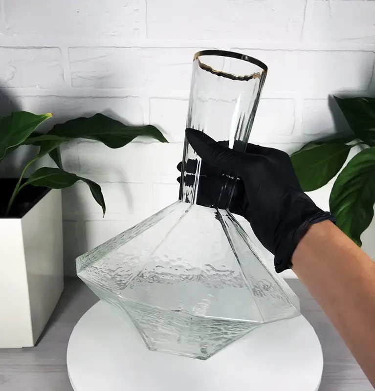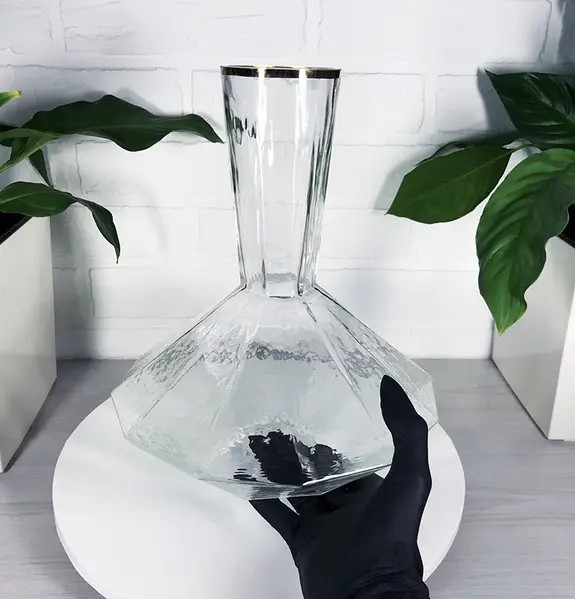 Изготовлен ручным способом путем заливания в пресс-формы жидкого стекла. Благодаря толстым стенкам любимое вино сохранит свою прохладу и позволит в полной мере насладиться своим чарующим букетом вкуса.