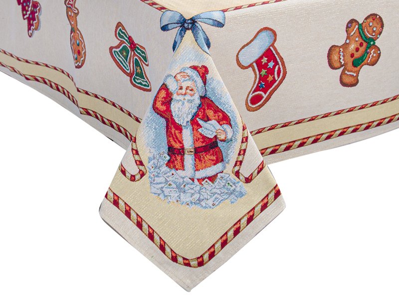 Эта новогодняя гобеленовая скатерть BISQUIT станет главным украшением вашего праздничного стола. Её нежный кремовый фон дополнен яркими деталями – Санта Клаус, пряничные человечки, носочки, колокольчики и ёлочные игрушки создают атмосферу радости и ожидания чуда. Такой декор сразу задаёт настроение и превращает ужин в сказочное торжество.