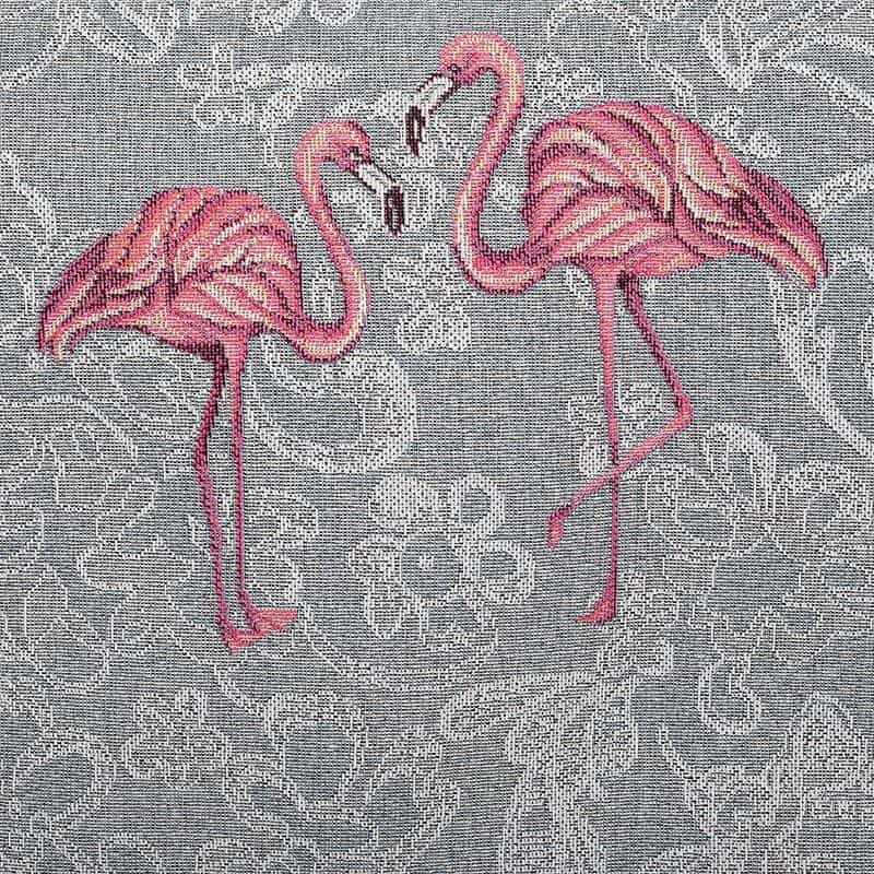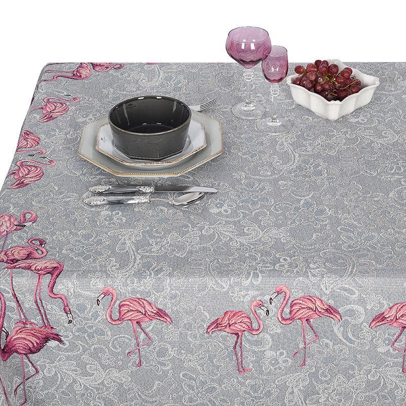 Рисунок скатерти из премиального испанского гобелена, как будто взят из волшебной сказки. Изящные длинноногие розовые фламинго расположились по краю и гуляют по среди облаков по серому небосводу. Основание скатерти имеет серый цвет с белыми разводами. Скатерть прекрасно впишется в интерьер, а также будет прекрасно смотреться в качестве сервировки праздничного стола.