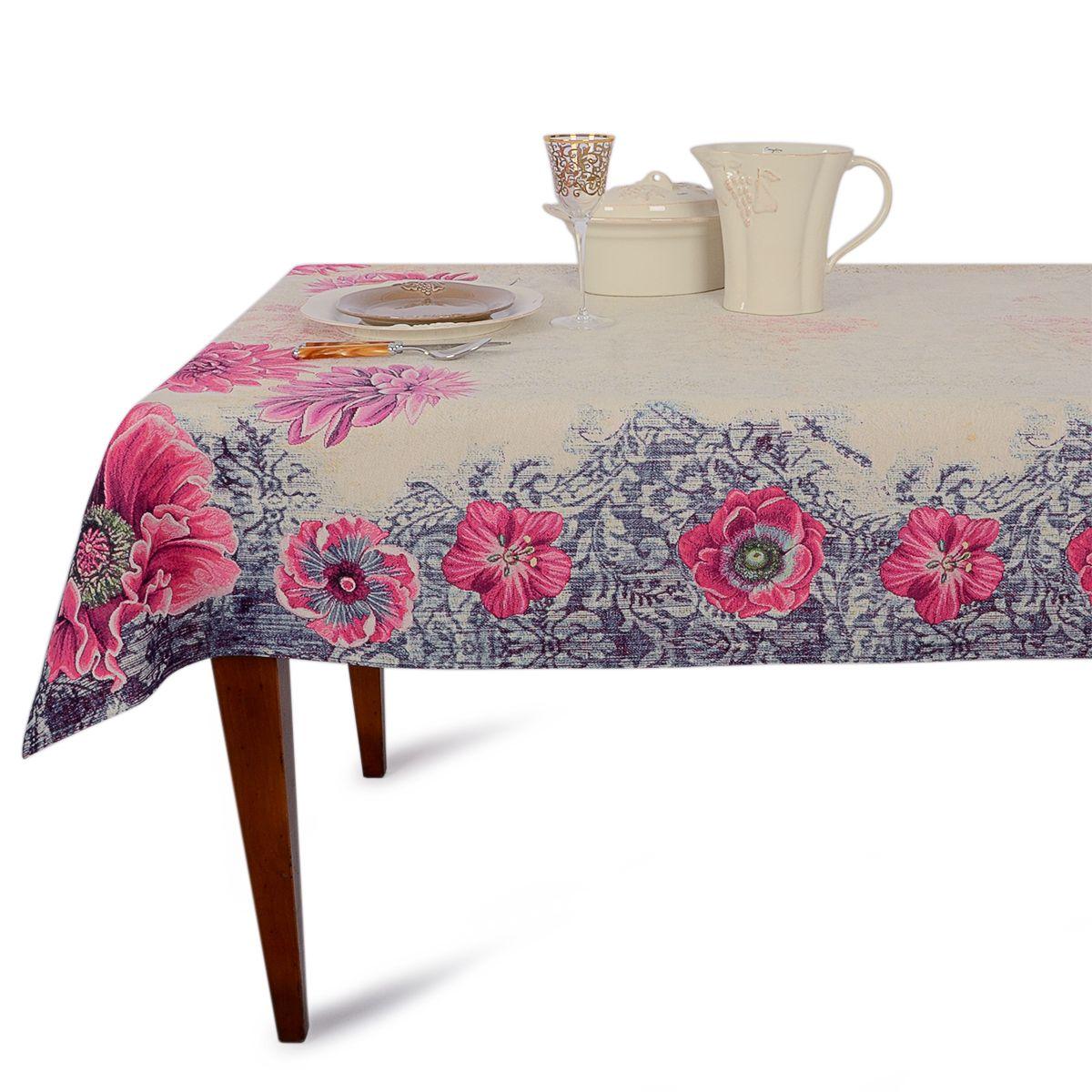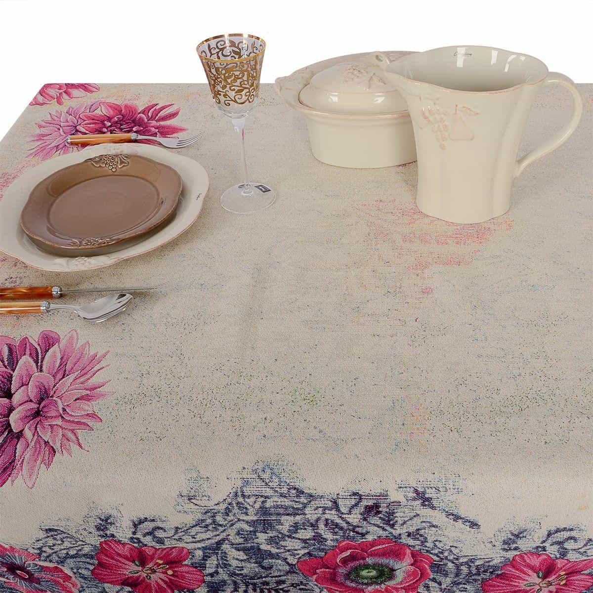 На прямоугольной скатерти стандартного размера на бежевом фоне расположились розовые цветы в компании с темно-синими узорами. Добавляет эффектности рисунку размытый отпечаток раппорта. Флористический дизайн вносит в домашнюю атмосферу покой и уют.